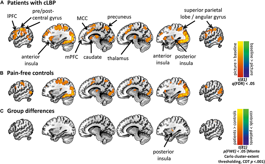 Figure 3. Activation maps for the MOVEMENT Picture Category at pre-EXP, per group. Statistical maps are presented showing the neural activation of the MOVEMENT category relative to baseline for (A) Patients with cLBP, and (B) Pain-free volunteers, (C) Group differences in MOVEMENT condition. Cluster-level correction using p < 0.001 as initial threshold. CDT, cluster-defining threshold. lPFC, lateral prefrontal cortex; mPFC, medial prefrontal cortex; MCC, mid-cingulate cortex.