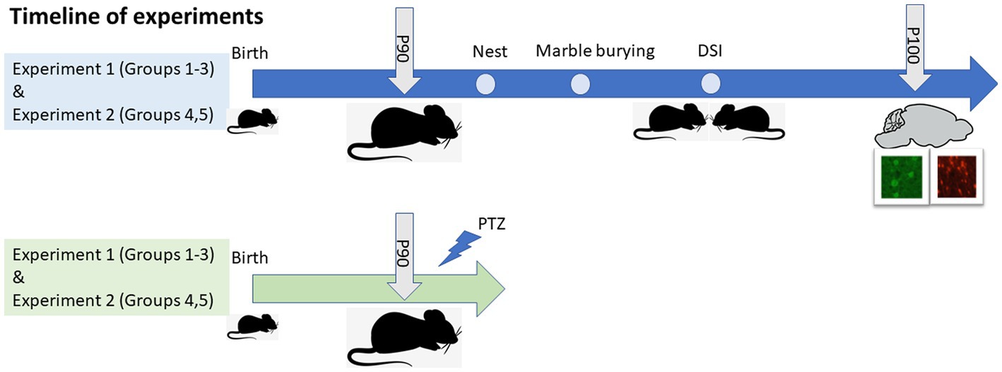 Figure 1. Experimental design and timeline of experiments. Two batches of mice were used for the study, presented in blue and green. P, Postnatal day; DSI, Direct social interaction; PTZ, pentylenetetrazol.