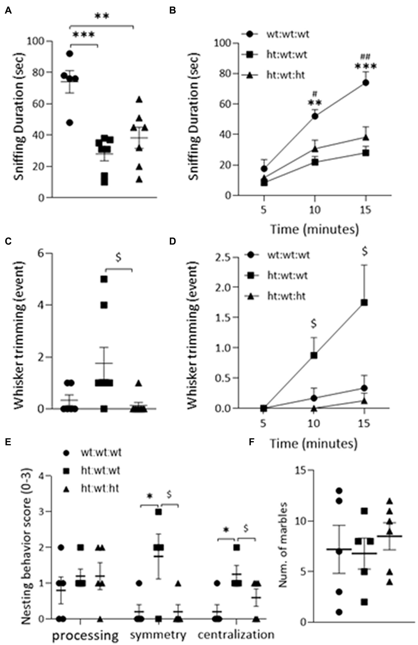 Figure 2. ASD-like behaviors observed in adult mice. Sociability was evaluated by the “DSI” test (A,B). The duration of “Sniffing” behavior was decreased by maternal Mthfr+/− genotype in the total 15 min of the test (F1,18 = 26.54, p < 0.001, two-way ANOVA) (A) and when analyzing the cumulative time (F1,16 = 20.15, p = 0.005, ANOVA for repeated measures) (B). (C) The number of “Whisker-trimming” events was increased by maternal Mthfr+/− genotype and decreased by offspring Mthfr+/− genotype (F1,21 = 5.5, p = 0.03, F1,21 = 8.46, p = 0.009, respectively, two-way ANOVA), and when analyzing the cumulative number of events (F1,19 = 6.09, p = 0.023, F1,19 = 20.15, p < 0.001, respectively, GLM for repeated measures) (D). Repetitive behavior was assessed by the “Nest building” (E) and the “Marble burying” tests (F). Nest symmetry was increased by maternal Mthfr+/− genotype and decreased by offspring Mthfr+/− genotype (F1,13 = 9.24, p = 0.011, F1,13 = 9.24, p = 0.01, respectively, two-way ANOVA). Nest centralization was increased by maternal genotype (F1,13 = 9.8, p = 0.01). Data are presented as means ± SEM. For the Sociability test, the N for groups 1, 2, & 3 = 6, 8, & 8, respectively. For the repetitive behavior tests, N = 6 per group. A one-way ANOVA with a Bonferroni post-hoc test *p < 0.05, **p < 0.01, ***p < 0.005 between wt:wt:wt and ht.:wt:wt, #p < 0.05, ##p < 0.01 between wt:wt:wt and ht.:wt:ht., $p < 0.05 between ht.:wt:wt and ht.:wt:ht. When averaged data are shown, bars represent SEM.