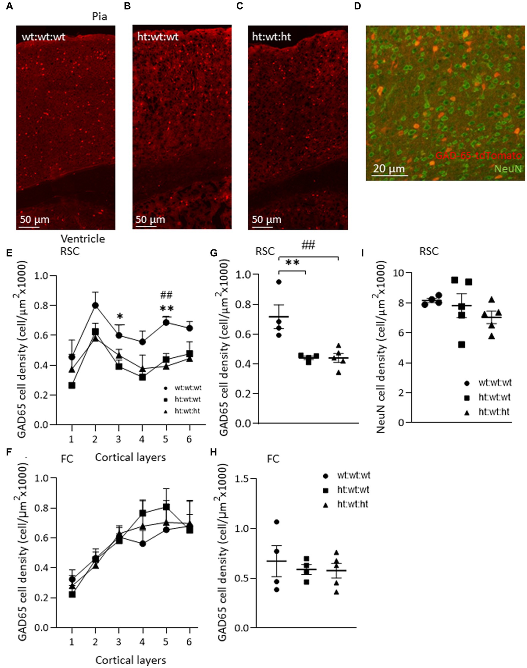 Figure 3. Maternal Mthfr+/− genotype is associated with interneuron deficiency in mice RSC. (A–C) Images of/ GAD65-tdTomato interneurons in the RSC of each experimental group, from top – pia, to bottom – ventricle. (D) An image of GAD65-tdTomato (red) and NeuN+ neurons (green) in the RSC. (E,G) GAD65-tdTomato interneuron density was reduced by the maternal Mthfr+/− genotype in the RSC (F1,12 = 15.84, p = 0.003, two-way ANOVA). The decrease in cell density was observed in all layers, most prominently in layers 3 and 5 (F1,10 = 36. 4, p < 0.001, ANOVA for repeated measures, F1,12 = 7.83, p = 0.019, F1,12 = 16.74, p = 0.002 two-way ANOVA, respectively). (F,H) A similar analysis of GAD65-tdTomato in the FC revealed no difference between groups. (I) NeuN cell density in the RSC. Data are presented as means ± SEM, N of group 1 = 4, of group 2 = 5, of group 3 = 5. One-way ANOVA with a Bonferroni post-hoc test *p < 0.05, **p < 0.01 between wt:wt:wt and ht.:wt:wt, ##p < 0.01 between wt:wt:wt and ht.:wt:ht.