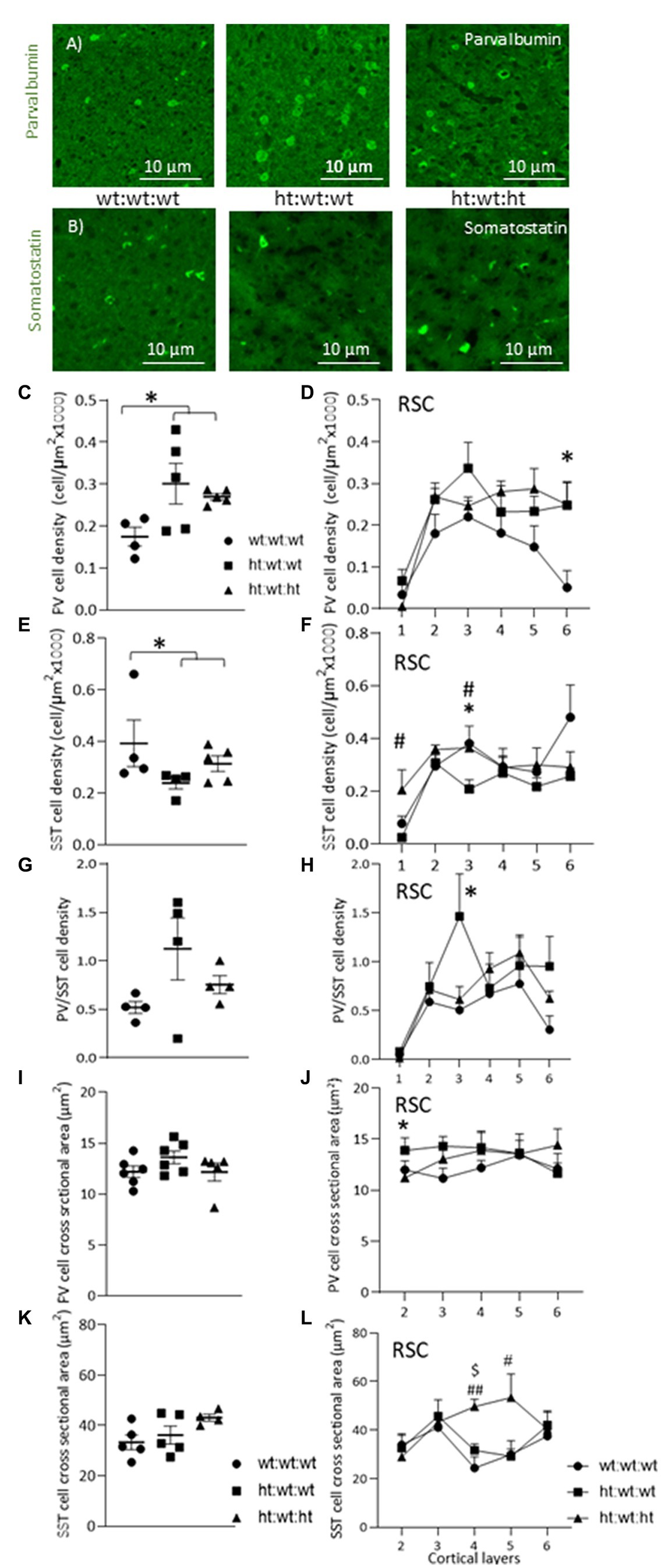 Figure 4. Effects of Mthfr+/− genotype on cortical PV and SST interneurons. (A,B) An example of PV and SST interneurons in Layer 3 of the RSC in the different experimental groups. (C,D) PV+ cell density was increased by maternal Mthfr+/− genotype (F1,13 = 7.19, p = 0.021, two-way ANOVA). (D) The alteration in PV+ cell density was seen throughout the entire cortical depth, with the most prominent change seen in L6 (F1,11 = 5.32, p = 0.042, ANOVA for repeated measures, F1,13 = 6.8, p = 0.024, two-way ANOVA, respectively). (E) SST+ cell density in the RSC. (F) When dividing the cortex into layers, offspring Mthfr+/− genotype increased and maternal Mthfr+/− genotype decreased SST+ cell density in layer 3 (F1,12 = 7.09, p = 0.024 and F1,12 = 7.79, p = 0.019, two-way ANOVA, respectively). (G) Cortical PV/STT ratio in the RSC. (H) Separate analyses of each layer showed that maternal Mthfr+/− genotype increased the PV/SST ratio in layer 3 (F1,10 = 6.14, p = 0.038, two-way ANOVA). (I) Average PV+ cell body cross sectional area (J) PV+ cell body cross sectional area was increased by the maternal Mthfr+/− genotype in layer 2 of the RSC (F1,16 = 4.82, p = 0.045, two-way ANOVA). (K) Average SST+ cell body cross sectional area. (L) SST+ cell body cross sectional area was increased by offspring Mthfr+/− genotype in layers 4 and 5 of the RSC (F1,13 = 11.66, p = 0.006 and F1,13 = 6.96, p = 0.023, two-way ANOVA respectively). Data are presented as means ± SEM. N = 6 groups 1, 2, and 3, respectively. One-way ANOVA with a Bonferroni post-hoc test *p < 0.05 between wt:wt:wt and ht.:wt:wt. #p < 0.05 between wt:wt:wt and ht:wt:ht., ##p < 0.01 between wt:wt:wt and ht.:wt:ht., $p < 0.05 between ht.:wt:wt and ht.:wt:ht.