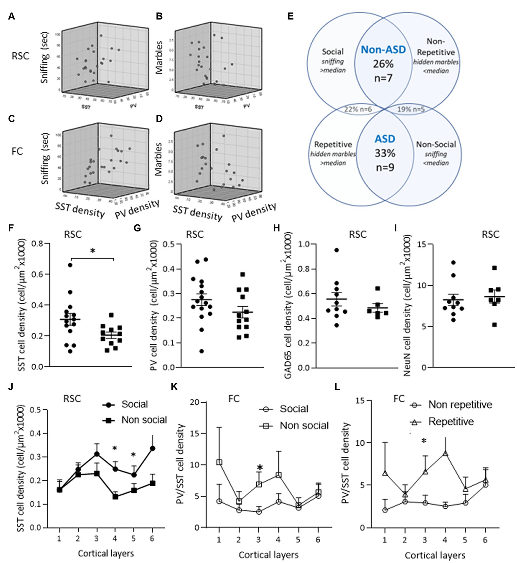 Figure 5. ASD-like phenotype and cortical interneurons. Relations between sniffing duration and number of hidden marbles with SST and PV interneuron densities in the RSC (A,B) and in the FC (C,D). (E) Mice phenotypes – mice were grouped by behavior as described in the methods. (F–J) Neuron densities in the RSC of the “Non-social” compared to the “Social” group: (F) SST+ cell density. (G) PV+ cell density. (H) Cortical cell densities of GAD65-tdTomato interneurons. (I) Density of the entire neuron population. (J) When analyzing each cortical layer separately, the decrease in SST+ cell density was observed in layers 4–6 of the RSC of the “Non-social” compared to the “Social” group (K,L) PV+/SST+ ratio in FC. (K) An increase in PV/SST ratio in layer 3 of the “Non-social” compared to the “Social” group. (L) An increase in PV+/SST+ ratio in layer 3 of the “Repetitive” compared to the “Non-repetitive” group. Data are presented as means ± SEM, N = 13 per group. *p < 0.05 student t-test between “Social” and “Non-social” groups, between “Non-ASD-like” and “ASD-like” and between “Non-repetitive” and “Repetitive” groups.