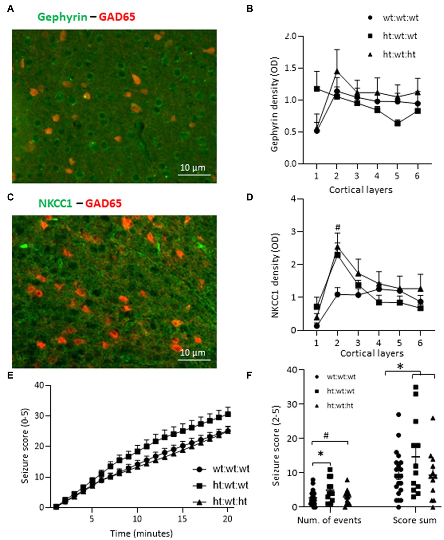 Figure 6. Effects of Mthfr genotype on mice susceptibility to seizure and molecular markers. (A) Example of gephyrin and GAD65-tdTomato in layer 3 of the RSC. (B) Gephyrin density in the RSC cortex. (C) Example of NKCC1 and GAD65-tdTomato in Layer 3 of the RSC. (D) NKCC1 density was increased by the maternal Mthfr+/− genotype in layer 2 of the RSC (F1,16 = 5.45, p = 0.035, two-way ANOVA). (E,F) Recordings of seizure scores for each minute after PTZ injection. (E) Cumulative seizure score for each minute of the 20-min test was enhanced by the maternal Mthfr+/− genotype and reduced by the offspring Mthfr+/− genotype (F1,55 = 6.06, p = 0.017, F1,55 = 8.99, p = 0.004, respectively, ANOVA for repeated measurements). N = 6 per group. One-way ANOVA with a Bonferroni post-hoc test #p < 0.05 between wt:wt:wt and ht.:wt:het. (F) Number of seizure events. The number of minutes during which the mouse’s number of seizure events was in the range of 2–5. The number of seizure events was increased by maternal Mthfr+/− genotype and decreased by offspring Mthfr+/− genotype (F1,58 = 5.47, p = 0.023, F1,58 = 4.96, p = 0.03, respectively, two-way ANOVA). The sum of the score for seizure events was also increased by maternal genotype (F1,58 = 4.71, p = 0.034, two-way ANOVA). Data are presented as means ± SEM. One way ANOVA with Bonferroni post-hoc test *p < 0.05 between wt:wt:wt and ht.:wt:wt. N: wt:wt:wt = 21, ht.:wt:wt = 12, ht.:wt:ht. = 12.