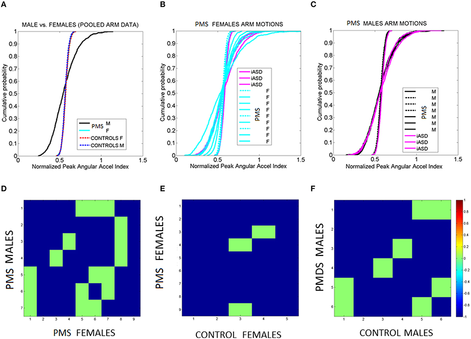 Figure 10. Fluctuations in arms' angular acceleration distinguish sex in PMS. (A) Empirical cumulative distribution function (eCDF) estimated from the fluctuations in normalized peak angular acceleration index obtained from arm motions during walking Data are pooled across all males and all females with PMS vs. all male and all female controls. (B) eCDF from each PMS female in relation to the three iASD (dashed curves fall near female control signatures). (C) eCDF from each PMS male in relation to the three iASD (dashed curves fall near male control signatures). Notice the contrast with (B). (D–F) Pairwise comparison matrices drawn using Kolmogorov-Smirnov test of two eCDFs. Entries are the log of the p-value from the test. Color bar indicates the log p-values. Entries colored in green are 0.05–0.07, thus failing to reject the null hypothesis that the differences in eCDFs are statistically significant at the 0.01 level. Blue entries mark near zero p-values, significant at the 0.01 level. Notice that 2 iASD fall with the larger number of PMS males and one iASD falls with the smaller number of PMS males.