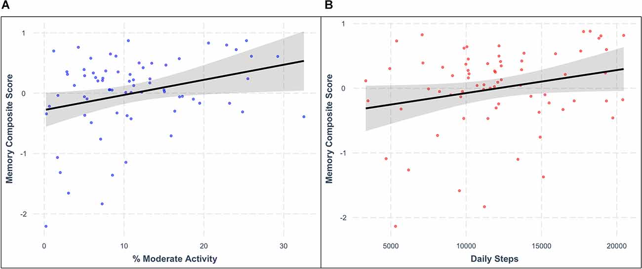 Figure 2. Relationships between memory composite score and (A) average percentage of time spent in moderate physical activity (β = 0.232, p = 0.027) and (B) average daily steps (β = 0.209, p = 0.037) after controlling for relevant covariates. Shaded areas represent the 95% confidence interval for each regression model.