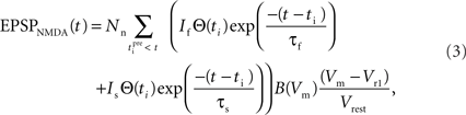 The equation that governs the behavior of AMPAR-mediated EPSPs in the model is similar to (1) having a slow and a fast exponential component: