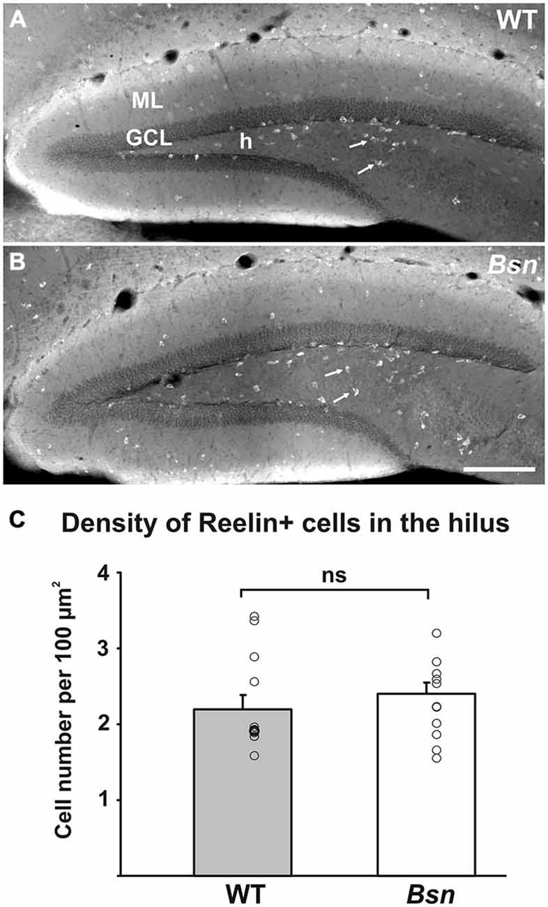 Figure 5. Distribution of Reelin immunoreactivity in the DG is comparable between WT and Bsn-mutant mice. Distribution of Reelin+ neurons (arrows) in the (A) WT and (B) Bsn-mutant DG. (C) Measurement of Reelin+ neuron density in the hilus revealed a lack of significant difference between genotypes. Data are shown as mean ± SEM. Circles represent single data points. Scale bar = 200 μm. Abbreviations: ML, molecular layer; GCL, granule cell layer; h, hilus; ns, not significant.