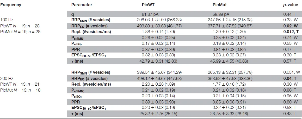 Quantal size (mEPSC amplitude) being unaltered, we next investigated the RRP size, release probability and pool dynamics to investigate the cause of the reduced eEPSC amplitude. We studied responses to high frequency train stimulation: 50 consecutive stimuli delivered at 100 and 200 Hz (in the presence of 1 mM Kynurenic acid and 100 μM CTZ). At these frequencies, both PicMut and PicWT mice exhibited comparable short-term depression (Figures 8A,A’). Both genotypes demonstrated similar kinetics of short-term depression during train stimulation (Tau (τ), Table 1; Figures 8B,B’). The paired pulse ratio (PPR) was not significantly altered at inter-stimulus intervals of 5 ms and 10 ms (Table 1). The extent of depression assessed as the amplitude in the steady-state reached after 30 train pulses was comparable (EPSC30–50/EPSC1, Table 1; Figures 8B,B’).