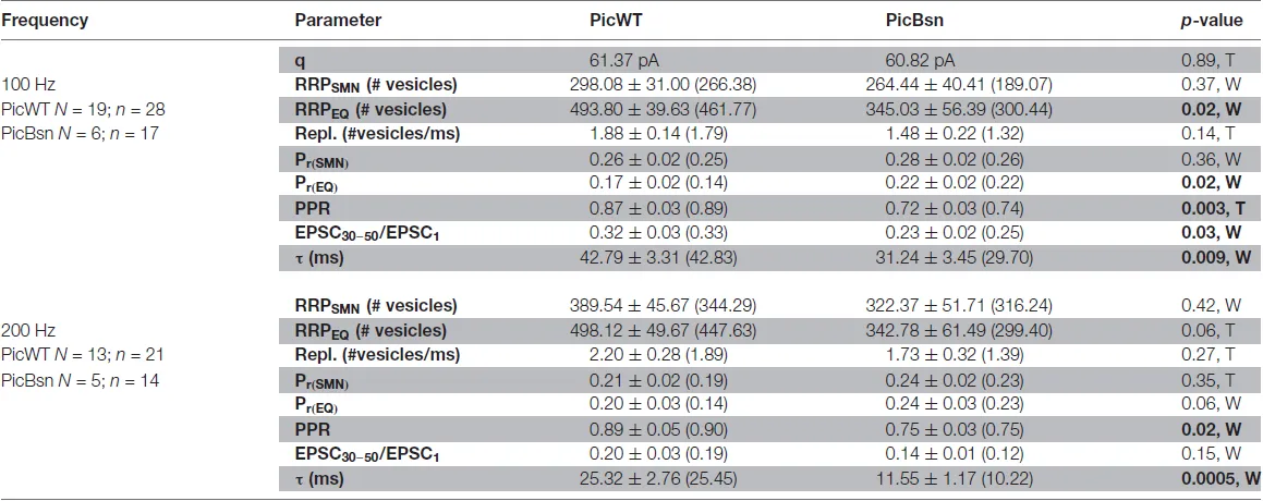 EQ analysis, but not SMN analysis, estimated a reduction in RRP. This discrepancy in the estimations of the two methods arises from the assumptions on which they are based. The SMN analysis estimates the pool size by the decrement in the vesicle pool during stimulation and is thus influenced by the extent of depression during the train (Neher, 2015). Hence, an increased depression (lower steady-state amplitude) at PicBsn endbulbs could overestimate RRP size giving values, comparable to that of the PicWT. EQ analysis on the other hand, estimates the RRP by forward-extrapolation, as it would have been before the onset of stimulation and is hence independent of the stimulation frequency used and the synaptic depression resulting therein (Neher, 2015). Considering the reduced RRP at the PicBsn synapses, we speculate that the “pseudo-rescue” of eEPSC amplitude is due to an increase in release probability as indicated by a lower PPR and higher Pr by the EQ cumulative analysis.