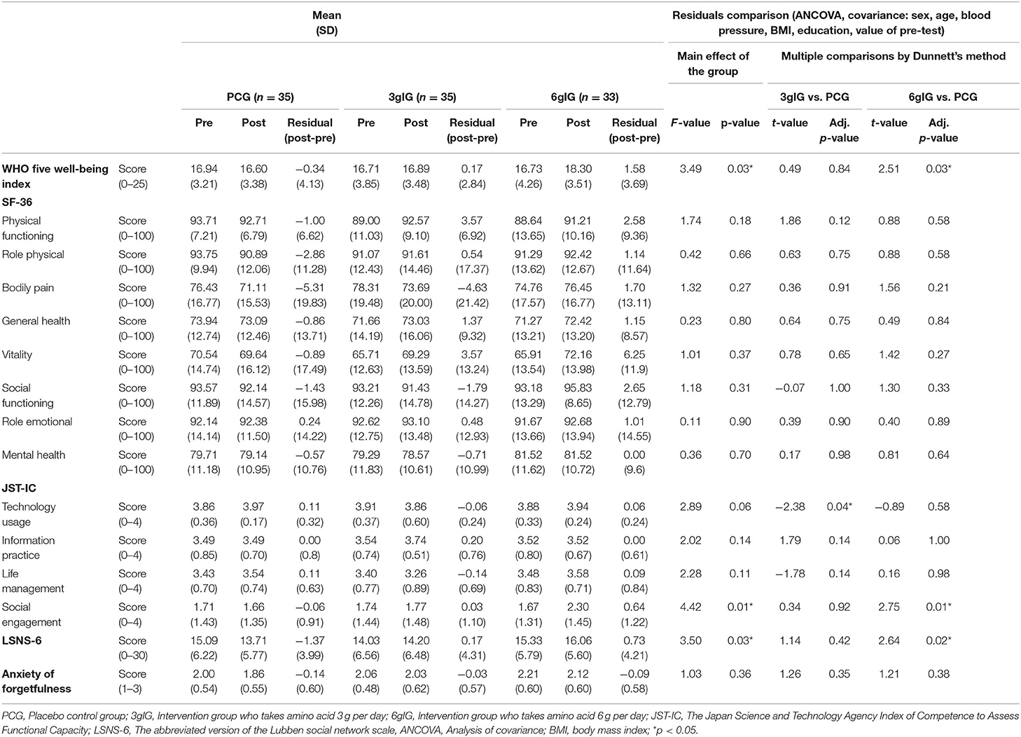 Results: The numbers of participants excluding dropouts were 35 in PCG and 3gIG and 33 in 6gIG. Analysis of covariance revealed that the 6gIG showed significantly improved cognitive function (Trail Making Test B), social interaction and psychological health scores after ingestion compared to the PCG (multiplicity adjusted p < 0.05).