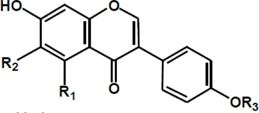 | Flavonoid groups and its derivatives | Daidzein: R1 = H; R2 = H; R3 = H Formononetin: R1 = H; R2 = H; R3 = OCH3 Glycitein: R1 = H; R2 = OCH3 Genistein: R1 = OH; R2 = H, R3 = H Biochanin A: R1 = OH; R2 = H; R3 = OCH3 | ![]() |