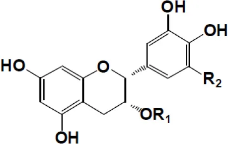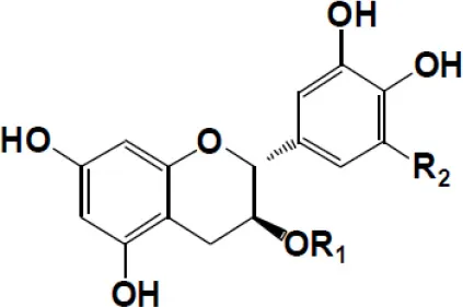 | (+)-Catechin: R1 = R2 = H (+)-Catechin gallate: R1 = gallyl, R2 = H (+)-Gallocatechin: R1 = H, R2 = OH (+)-Gallocatechin gallate: R1 = gallyl, R2 = OH | ![]() | |