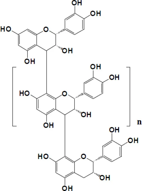 | Condensed tannins | Mono-, di-, trimers 4–6 mers, 7–10 mers, polymers | ||