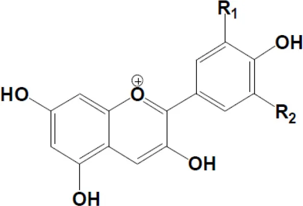 | Anthocyanidins Cyanidin R1 = –OH; R2 = –H Delphinidin R1 = –OH; R2 = –OH Pelargonidin R1 = –H R2 = –H Malvidin R1 = –OCH3 R2 = –OCH3 Peonidin R1 = –OCH3 R2 = –H Petunidin R1 = –OH R2 = –OCH3 | ![]() | |