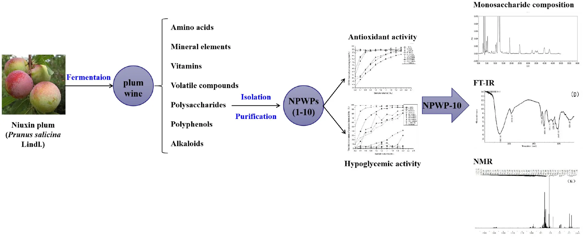 With the increase in demand of fruit wine year by year, it is necessary to develop novel fruit wine with high functional activities. Prunus salicina Lindl. (named as Niuxin plum) is a remarkable material for brewing fruit wine owing to its suitable sugar-acid ratio, characteristic aroma and bioactive compounds. This study intends to modify the fermentation technology, identify and quantify nutritional compositions and volatile profiles, as well as bioactive substances in Niuxin plum wine, as well as evaluate the antioxidant and hypoglycemic activities in vitro of major bioactive components from Niuxin plum wine. According to single-factor and orthogonal tests, the optimal fermentation conditions of 13.1% vol Niuxin plum wine should be Saccharomyces cerevisiae Lalvin EC1118 at 0.1% and a fermentation temperature of 20°C for 7 days. A total of 17 amino acids, 9 mineral elements, 4 vitamins, and 55 aromatic components were detected in plum wine. Polysaccharides from Niuxin plum wine (named as NPWPs) served as the major bioactive components. The NPWP with a molecular weight over 1,000 kDa (NPWP-10) demonstrated extraordinary DPPH free radical scavenging capacity and α-glucosidase inhibitory activity among all NPWPs having different molecular weight. Moreover, the structural characterization of NPWP-10 was also analyzed by high performance liquid chromatography (HPLC), fourier-transform infrared (FT-IR) and nuclear magnetic resonance (NMR) spectra studies. NPWP-10 was composed of mannose, rhamnose, arabinose, galactose and galacturonic acid with molar ratios of 2.570:1.775:1.045:1.037:1. NPWP-10 contained α-configuration as the main component and β-configuration as the auxiliary component. This study highlights NPWP-10 is an importantly biological polysaccharide from Niuxin plum wine, as well as provides a scientific basis for developing the plum wine industry.
