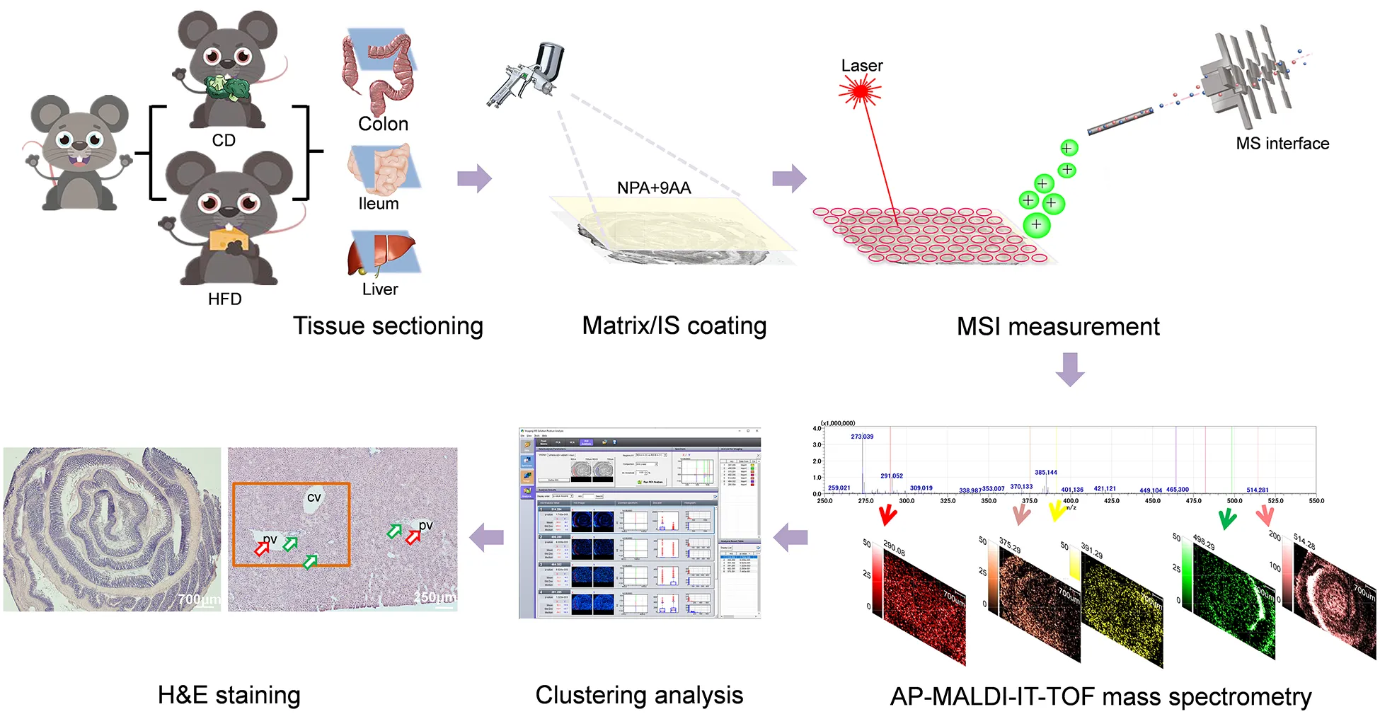 Thus, in our study, the iMScope was adapted to investigate the spatial distribution and molecular profiling of BAs in the liver and intestine slices of a mouse under high-fat diet (HFD) to indicate the effects of metabolism of BAs on the health and diseases of the body.