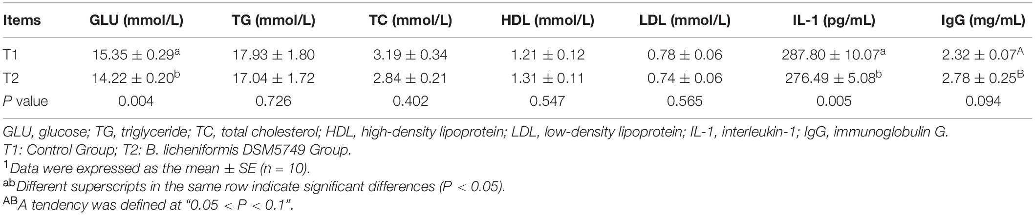 Glucose (GLU), triglyceride (TG), total cholesterol (TC), low-density lipoprotein (LDL), and high-density lipoprotein (HDL) were analyzed using a fully automatic biochemical analyzer (7020; Hitachi, Co., Ltd., Tokyo, Japan). The immune response status in the serum was estimated by detecting the levels of interleukin 1 (IL-1) and immunoglobulin G (IgG) with enzyme-linked immunosorbent assay (ELISA) kits (MLBIO Co., Ltd., Shanghai, China). All operations were carried out in accordance with the kits’ instructions. The inter- and intra-assay coefficients of variation (CVs) were less than 10%.