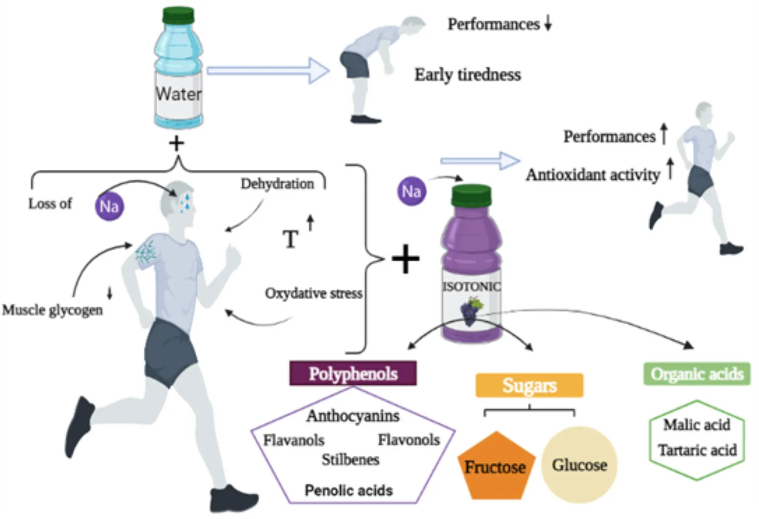 Nowadays, the sector of isotonic beverages has developed its market based on fruit juices that provide a sports drink with antioxidant and biological activities in addition to their principal role of rehydration and replacement of minerals and carbohydrates during physical exercise. Consumption of grape juice is increasing worldwide because of its sensory characteristics and nutritional value. It contains mainly water, sugars, organic acids, and phenolic compounds. Phenolic compounds play a major role in prevention of various diseases through their biological activities linked to antioxidant, anti-inflammation, anticancer, anti-aging, antimicrobial, and cardioprotective properties. Several studies have demonstrated that grape juice is able to improve performances of antioxidant activity, protect against oxidative damage, and reduce inflammation during sports activities. Polyphenol content also provides a great sensory profile, mainly color which is an important indicator for consumers when choosing beverage products. The contribution of grape juice through its nutritional value and sensory properties makes it an alternative for the development of a new isotonic drink that will be a novel and healthy product in the field of healthy beverages.