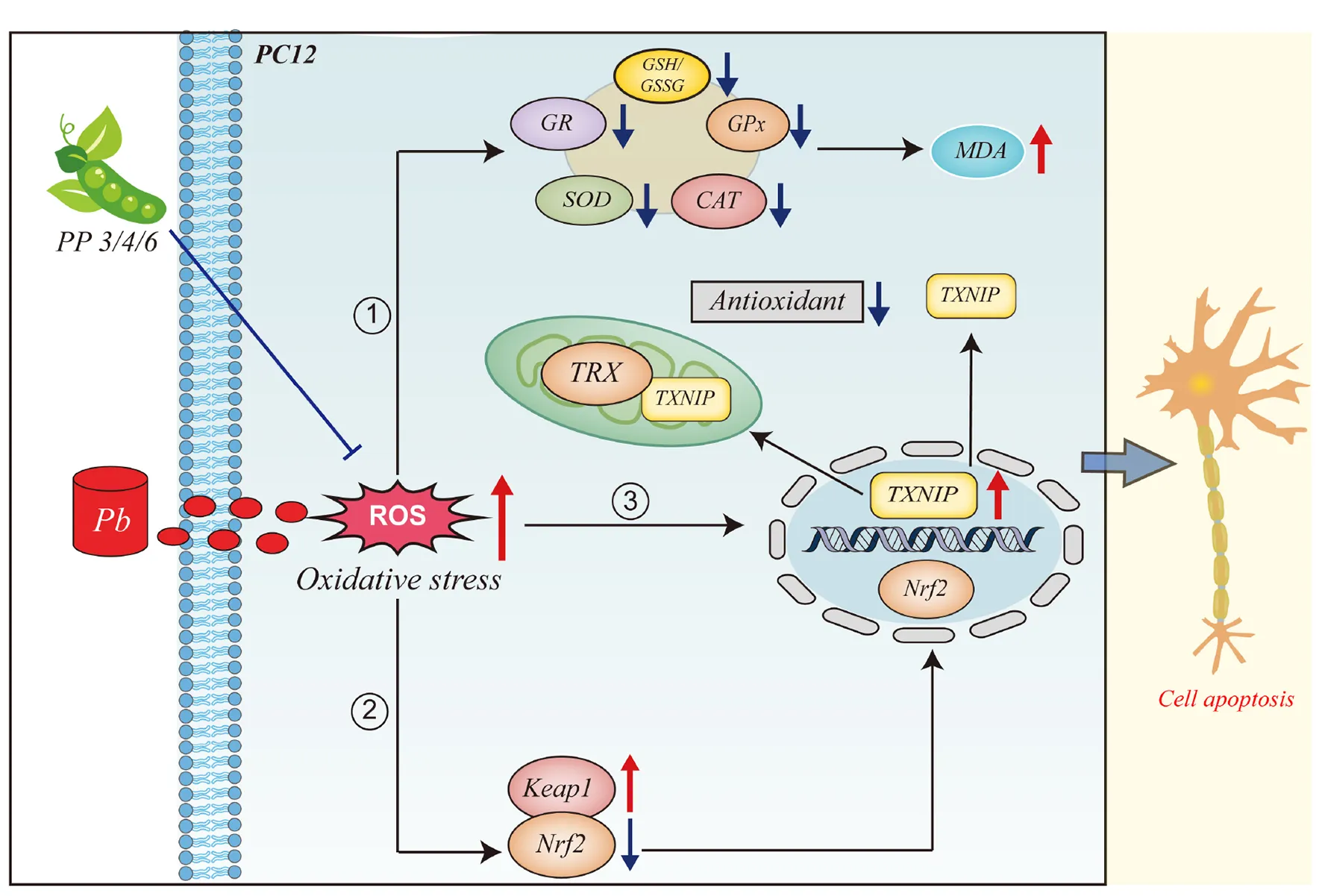 This figure illustrates the mechanism of action of PP3, PP4, and PP6 in mitigating oxidative stress due to lead exposure. When PC12 cells are exposed to lead, large amounts of ROS are produced, leading to oxidative stress. (1) The intracellular antioxidant system is inhibited, and large lipid peroxides are produced. (2) The intracellular expression level of Keap1 is increasedand the expression level of Nrf2 is decreased and translocated to the nucleus by dissociating from Keap1 in the cytoplasm. (3) The intracellular level of TXNIP is increased and translocated from the nucleus to translocate to the cytoplasm and mitochondria to bind to TRX and inhibit the antioxidant system of the organism. (4) Pre-incubation with PP3, PP4 and PP6 reversed this phenomenon.