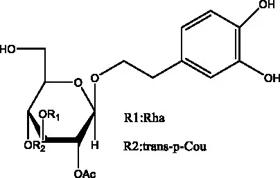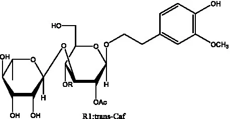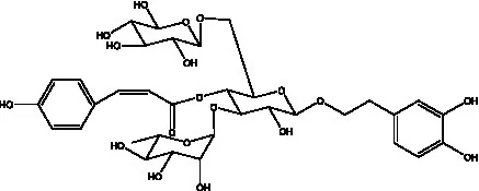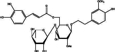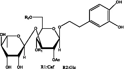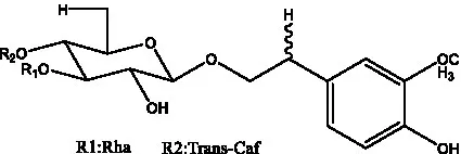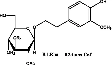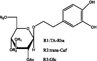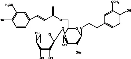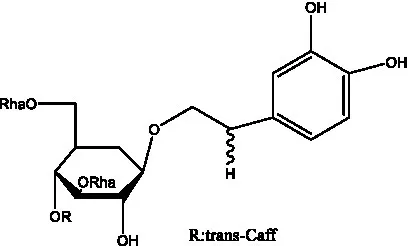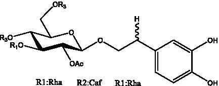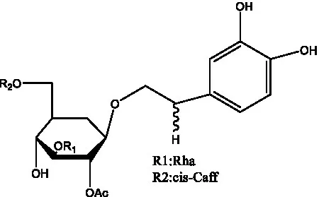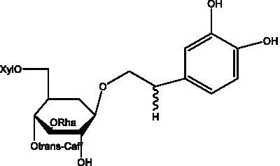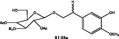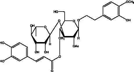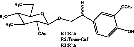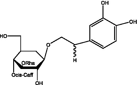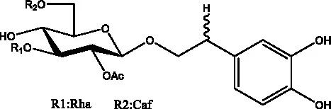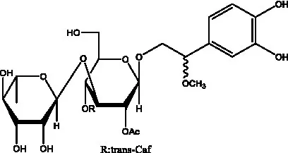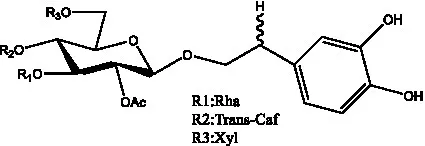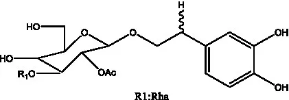 ![]() | 2′-O-acetylpoliumoside | (40) | ![]() | 2’-Acetylacteoside | (26, 30) |