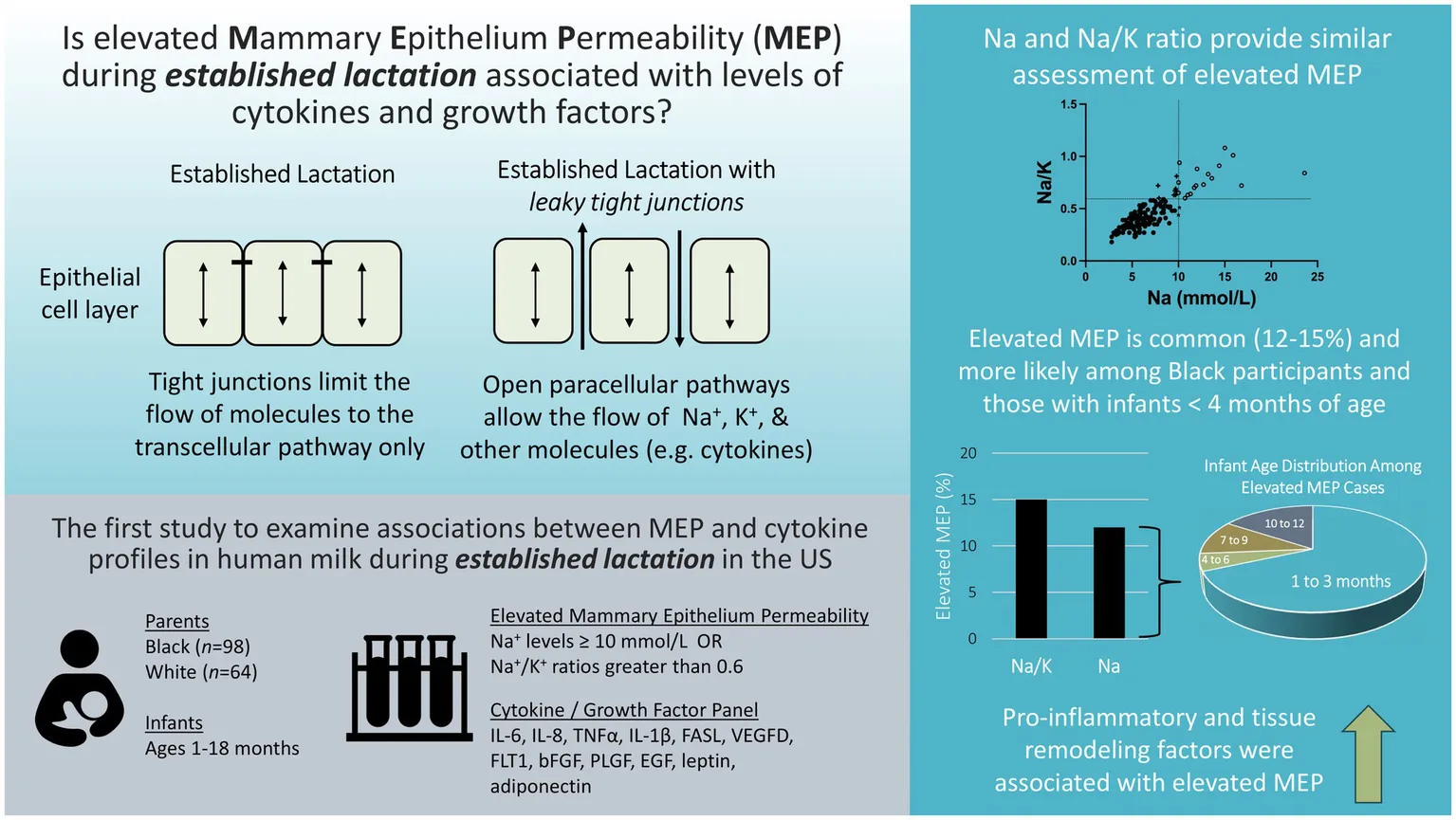 As long as the paracellular pathways remain closed during established lactation, milk secretion is maintained and levels of Na and the Na/K ratio remain low (19). However, both milk accumulation and inflammation have been linked to the re-opening of tight junctions and rising Na or Na/K ratios (19, 23). Our lab recently demonstrated that shifts in the Na/K ratio were closely linked to anti-SARS-CoV-2 antibody levels in human milk within a single individual over time, confirming an association between permeability and immune factors (24). Knowledge of MEP could provide important context for the interpretation of cytokine levels in human milk.