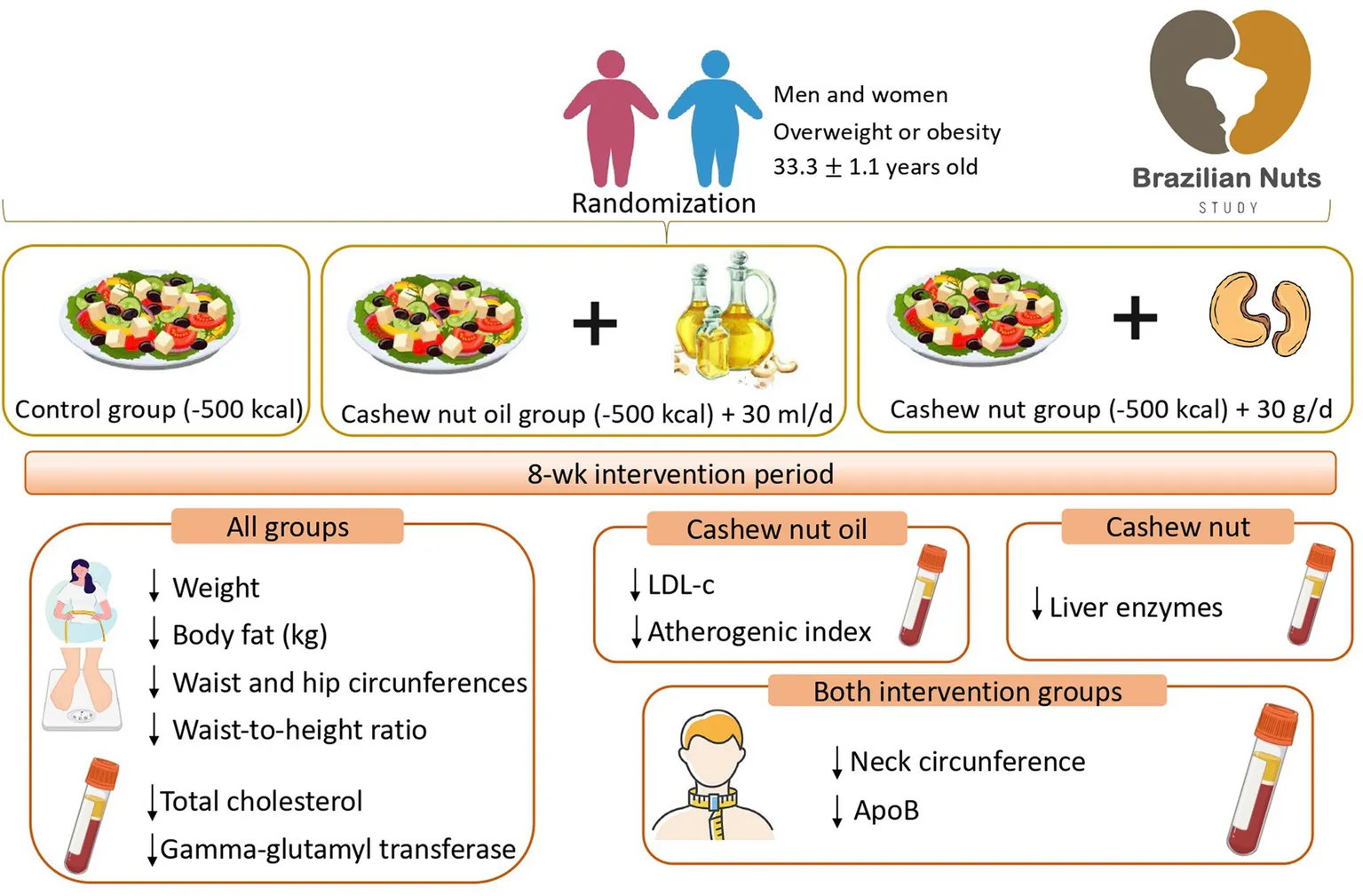 Cashew nut contains bioactive compounds that modulate satiety and food intake, but its effects on body fat during energy restriction remains unknown. This study aimed to assess the effects of cashew nut and cashew nut oil on body fat (primary outcome) as well as adiposity, cardiometabolic and liver function markers (secondary outcomes).