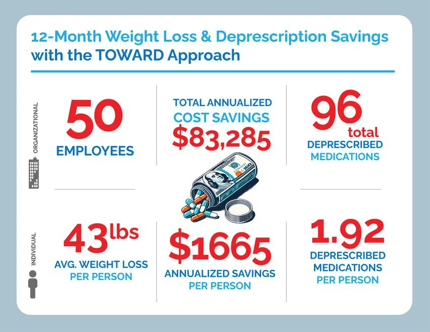 Historically, few employee wellness programs have documented strong efficacy in managing diabetes or obesity. Our previously published 6-month data using the TOWARD approach demonstrated significant results on weight, Atherosclerotic Cardiovascular Disease (ASCVD) risk and cost-savings (16). In this paper, we present a focused review of the one-year weight loss results and cost savings from medication deprescription from 50 patients who self-selected to participate.