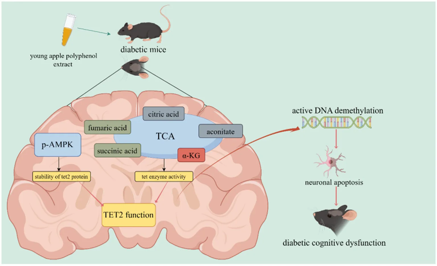 Following a 14-weeks intervention, disrupted cognitive function and neuronal apoptosis were observed in DM group, both of which were effectively restored by YAPE supplementation through improving ten-eleven translocation protein 2 (TET2)-mediated active DNA demethylation. Moreover, YAPE supplementation enhanced TET2 protein stability by activating phosphorylated AMP-activated protein kinase (AMPK) and improved TET enzyme activity by upregulating α-ketoglutarate/(succinic acid + fumaric acid) ratio, subsequently enhancing TET2 function.