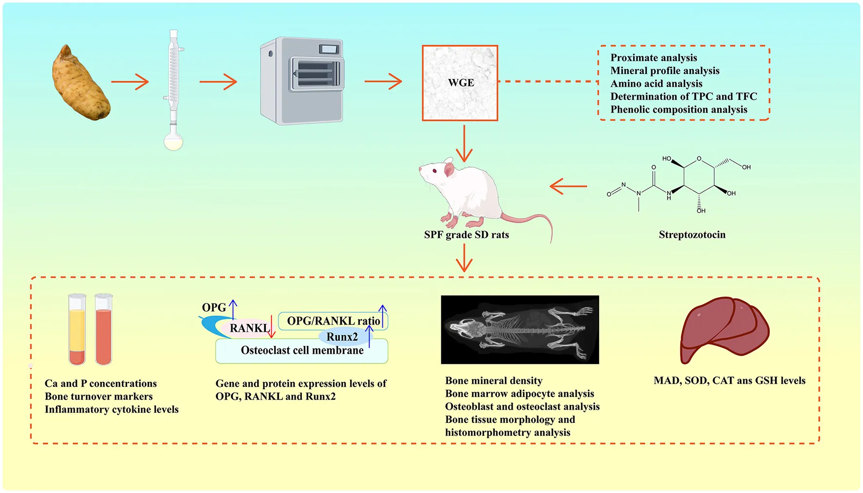 In this study, WGE was prepared and analyzed for moisture, ash, protein, lipid, mineral, amino acid, total phenolic, and flavonoid content. WGE was analyzed using ultra-high performance liquid chromatography coupled with quadrupole time-of-flight mass spectrometry (UPLC-Q-TOF/MS). Furthermore, the effect of WGE on streptozotocin-induced osteoporosis in diabetic rats was explored, along with an in-depth examination of the underlying mechanisms.