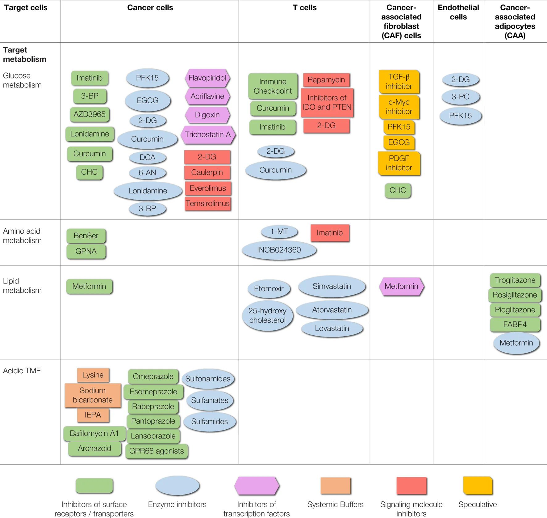 Therapeutic agents (small molecules) targeting different cells of the TME and their associated metabolism.