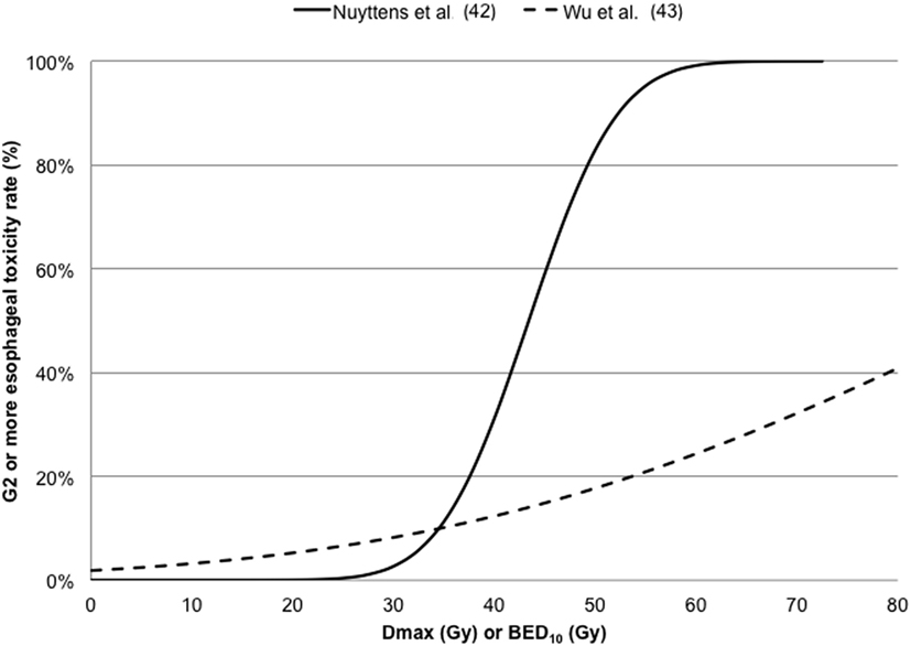 Nuyttens et al. (42) described G2 esophageal toxicity using the LQ survival model and the LKB EUD model. Dose–response model for G2 esophagitis was reported for EUD, D10%, D5 cc, D1 cc, and Dmax in terms of 5-fraction equivalent dose using an α/β ratio of 3 Gy. The calculated TD50(V) (95% CI) and γ50 (95% CI) were 29.4 (26.9, 40.5) and 2.84 (1.11, 5.54) for EUD; 30.0 (26.7, 43.8) and 2.25 (0.97, 4.44) for D10%; 27.4 (23.0, 43.4) and 1.59 (0.81, 2.98) for D5cc; 32.9 (29.9,44.9) and 2.73 (1.10,5.75) for D1cc; and 43.4 (39.4,62.7) and 2.66 (1.02,5.40) for Dmax, respectively. Comparing data of two published dataset including the (42) for estimating a complication probability of 50% for grades 2 and 3 toxicity, the dose at 1cc (D1cc) resulted 32.9 and 50.7 Gy, respectively; while Dmax resulted 43.4 and 61.4 Gy, respectively.