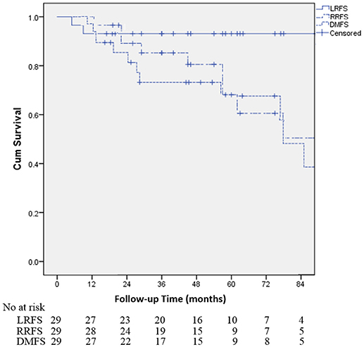 Figure 2. Kaplan-Meier curves for the cohort illustrating for local recurrence-free survival (LRFS), regional recurrence-free survival (RRFS) and distant metastases-free survival (DMFS).