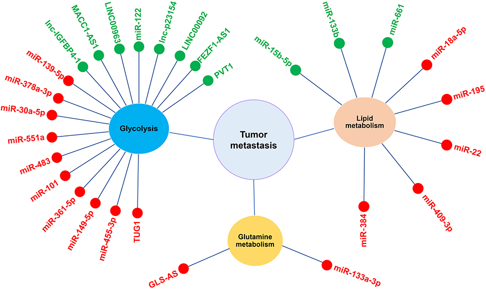 Figure 4. NcRNAs participate in tumor metastasis by regulating metabolic reprogramming. Red and green pellets represent ncRNAs that inhibit and promote, respectively, the metastasis through regulating glycolysis, lipid metabolism or glutamine metabolism.