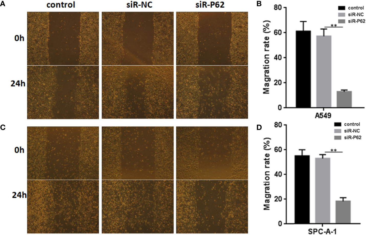 Figure 4 p62 downregulation inhibits the migration of A549 and SPC-A-1 cells. (A) Migration of A549 cells with different p62 expression. (B) p62 downregulation inhibited the migration of A549 cells. (C) Migration of SPC-A-1 cells with different p62 expression. (D) p62 downregulation inhibited the migration of SPC-A-1 cells. control, untreated A549 or SPC-A-1 cells; siR-p62, small interfering p62 RNA transfected cells; siR-NC, siR-p62 scrambled control. **P < 0.01.