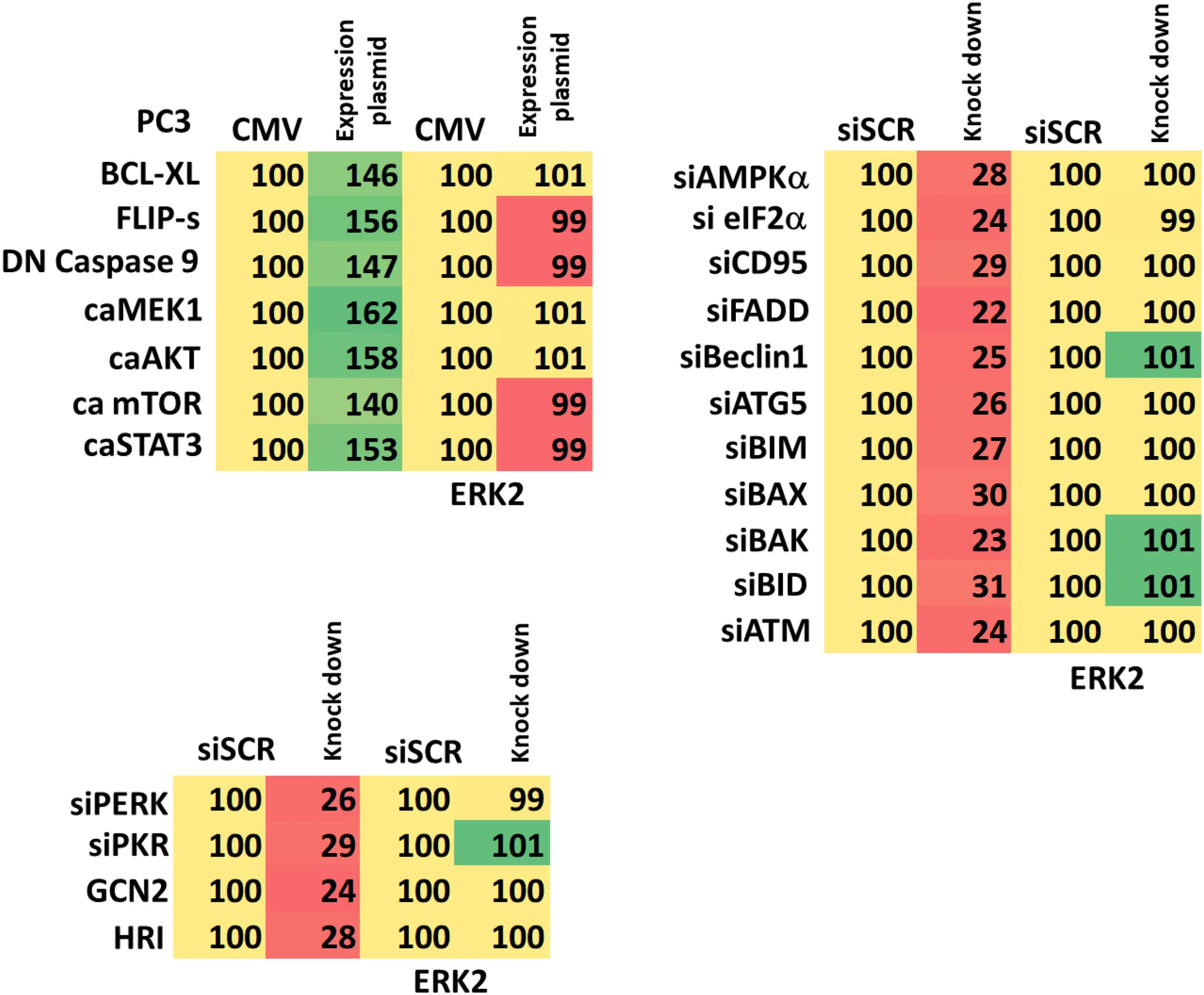 PC3 cells as indicated were transfected with siRNA molecules to knock down the expression of the indicated proteins or transfected with plasmids to over-express the indicated proteins. The percentage remaining after knock-down or the percentage over-expression above basal levels is indicated. (n = 3 +/-SD) (total ERK2 is included as an invariant total protein loading control).
