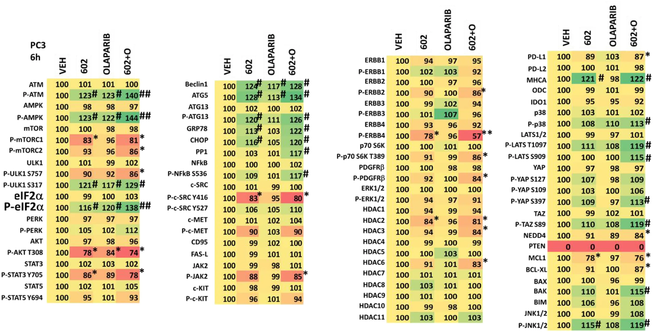 We then examined the impact of GZ17-6.02 and olaparib on cell signaling and protein expression levels in the three cell lines (Tables 2-4). Compared to prior studies in other tumor cell types such as pancreatic, liver, or colorectal, we observed significantly greater activation of ATM and the AMPK (p < 0.05). The phosphorylation of eIF2α was also robustly enhanced in the prostate cancer cell lines compared to GI tumor types, yet in contrast to prior work in other tumor cell types, the phosphorylation of PKR-like endoplasmic reticulum kinase (PERK) was not significantly elevated. Other indicators of a strong ER stress response, including elevated expression of Beclin1, ATG5, and GRP78 were evident, whereas the levels of CHOP were only enhanced in PC3 cells. In all three lines, the drug combination reduced expression of HDAC2, HDAC3 and HDAC6. LNCaP and PC3 cells do not express PTEN, yet the drug combination inactivated AKT, mTOR and p70 S6K in these lines as well as in DU145 cells. Unlike other tumor cell types previously tested, in all three prostate lines, the drug combination significantly enhanced activity in the c-Jun NH2-terminal kinase (JNK) pathway.