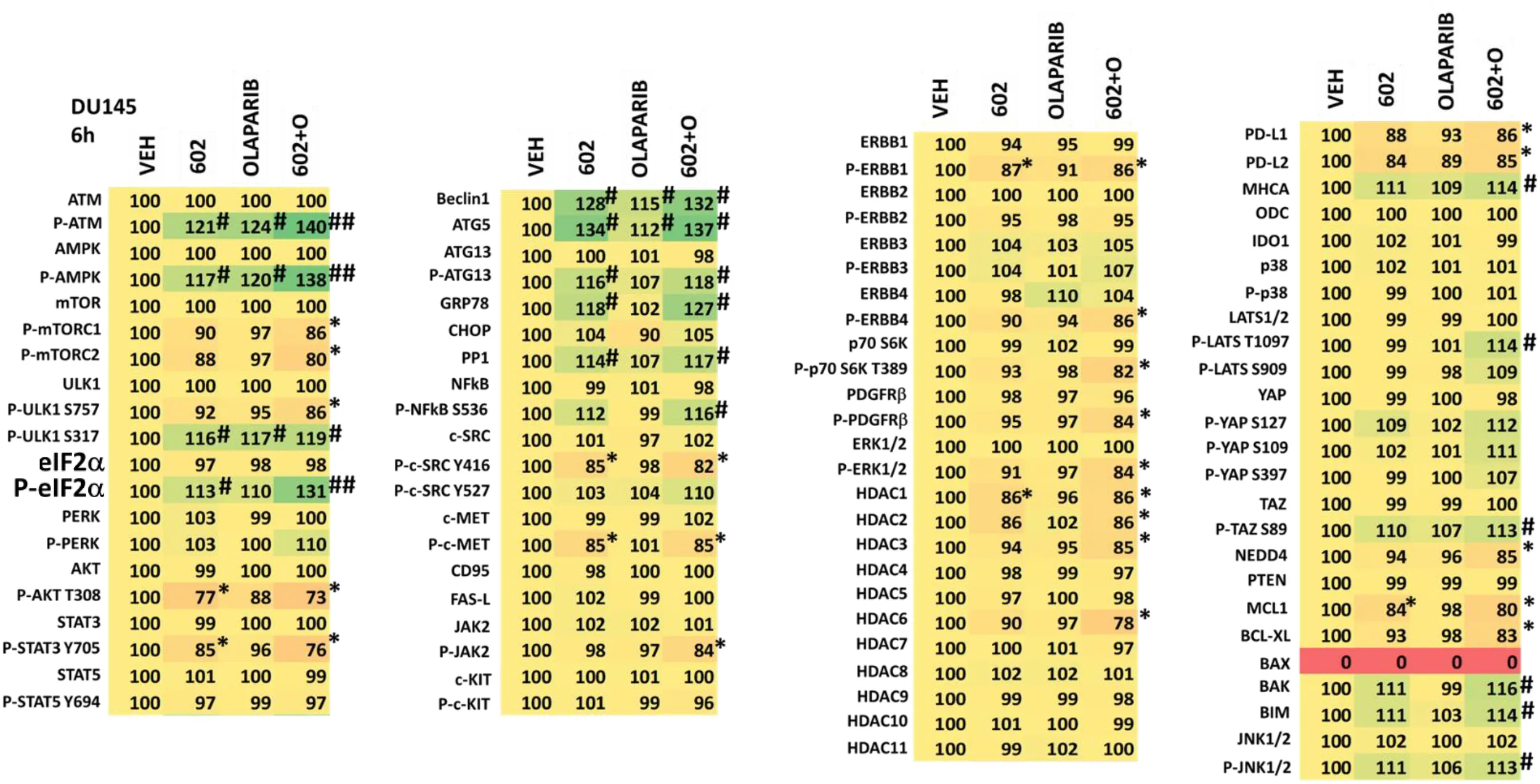 The LNCaP, PC3 and DU145 cell lines were obtained from the ATCC (Bethesda, MD). Olaparib was purchased from Selleckchem (Houston, TX). All Materials were obtained as described in the references (1–6). Trypsin-EDTA, DMEM, RPMI, penicillin-streptomycin were purchased from GIBCOBRL (GIBCOBRL Life Technologies, Grand Island, NY). Other reagents and performance of experimental procedures were as described (1–6). Antibodies were purchased from Cell Signaling Technology (Danvers, MA); Abgent (San Diego, CA); Novus Biologicals (Centennial, CO); Abcam (Cambridge, UK); and Santa Cruz Biotechnology (Dallas, TX). Cell Signalling antibodies: ATM (D2E2) Rabbit mAb #2873; Phospho-ATM (Ser1981) (D25E5) Rabbit mAb #13050; AMPKα #2532; Phospho-AMPKα (Thr172) (D4D6D) Rabbit mAb #50081; mTOR #2972; Phospho-mTOR (Ser2448) #2971; Phospho-mTOR (Ser2481) #2974; ULK1 (R600) #4773; Phospho-ULK1 (Ser317) #37762; Phospho-ULK1 (Ser757) #6888; eIF2α #9722; Phospho-eIF2α (Ser51) #9721; PERK (D11A8) Rabbit mAb #5683; Phospho-PERK (Thr980) (16F8) Rabbit mAb #3179; AKT Antibody #9172; Phospho-AKT (Thr308) (244F9) Rabbit mAb #4056; STAT3 (124H6) Mouse mAb #9139; Phospho-STAT3 (Tyr705) Antibody #9131; STAT5 (D2O6Y) Rabbit mAb #94205; Phospho-STAT5 (Tyr694) #9351; Beclin-1 #3738; ATG5 (D5F5U) Rabbit mAb #12994; ATG13 (D4P1K) Rabbit mAb #13273; Phospho-ATG13 (Ser355) (E4D3T) Rabbit mAb #46329; GRP78/BiP #3183; CHOP (L63F7) Mouse mAb #2895 PP1α Antibody #2582; NFκB p65 (L8F6) Mouse mAb #6956; Phospho-NFκB p65 (Ser536) (93H1) Rabbit mAb #3033; Src (36D10) Rabbit mAb #2109; Phospho-Src Family (Tyr416) (E6G4R) Rabbit mAb #59548; Phospho-Src (Tyr527) Antibody #2015; c-MET (25H2) Mouse mAb # 3127; Phospho-MET (Tyr1234/1235) Antibody #3126; FAS (4C3) Mouse mAb #8023; FAS-L (D1N5E) Rabbit mAb #68405; JAK1/2 (6G4) Rabbit mAb #3344; Phospho-Jak1 (Tyr1034/1035)/Jak2 (Tyr1007/1008) (E9Y7V) Mouse mAb #66245; c-KIT (D13A2) XP® Rabbit mAb #3074; Phospho-c-KIT (Tyr719) Antibody #3391; HER/ErbB Family Antibody Sampler Kit #8339; p70 S6 Kinase #9202; Phospho-p70 S6 Kinase (Thr389) #2904; PDGF Receptor beta #3164; Phospho-PDGF Receptor beta (Tyr754) (23B2) Rabbit mAb #2992; Phospho-p44/42 MAPK (Erk1/2) (Thr202/Tyr204) (20G11) Rabbit mAb #4376; Histone Deacetylase (HDAC) Antibody Sampler Kit #9928; HDAC7 (D4E1L) Rabbit mAb #33418; HDAC8 (E7F5K) Rabbit mAb #66042; HDAC11 (D5I8E) Rabbit mAb #58442; MHC Class II (LGII-612.14) Mouse mAb #68258; p38 MAPK #9212; Phospho-p38 MAPK (Thr180/Tyr182) (3D7) Rabbit mAb #9215; LATS1 (C66B5) Rabbit mAb #3477; Phospho-LATS1/2 (Ser909) #9157; Phospho-LATS1/2 (Thr1079) (D57D3) Rabbit mAb #8654; YAP (1A12) Mouse mAb #12395; Phospho-YAP (Ser127) (D9W2I) Rabbit mAb #13008; Phospho-YAP (Ser109) (E5I9G) Rabbit mAb #53749; Phospho-YAP (Ser397) (D1E7Y) Rabbit mAb #13619; TAZ (E8E9G) Rabbit mAb #83669 Phospho-TAZ (Ser89) (E1X9C) Rabbit mAb #59971; NEDD4 Antibody #2740; PTEN Antibody #9552; Estrogen Receptor α (D6R2W) Rabbit mAb #13258; Cyclin Antibody Sampler Kit #9869; BCL-XL #2762; MCL-1 (D35A5) Rabbit mAb #5453; BAX #2772; BAK #2814; BIM #2819; JNK1/2 #9252; Phospho-JNK (Thr183/Tyr185) (81E11) Rabbit mAb #4668; p44/42 MAPK (ERK1/2) (L34F12) Mouse mAb #4696). Santa Cruz Biotechnology antibodies: Histone Deacetylase 9 (HDAC9) (B-1) #sc398003; Histone Deacetylase 10 (HDAC10) (E-2) #393417. ABCAM antibodies: Anti-PD-L1 [28–8] (ab205921); Anti-PD-L2 [EPR25200-50] (ab288298); Anti-Ornithine Decarboxylase/ODC [ODC1/2878R] (ab270268); BAG3 ab92309; HSP90 (#2928); HSP90 (ab195575); HSP90 3G3 (13495); GRP78 (ab191023); GRP78 (ab103336); HSP27 [EP1724Y] (ab62339). Specific multiple independent siRNAs to knock down expression were purchased from Qiagen (Hilden, Germany). Human: HSP90 GeneGlobe ID SI03028606; HSP70 GeneGlobe ID SI04324481; GRP78 GeneGlobe ID SI00443114; Beclin-1 GeneGlobe ID SI00055573; ATG5 GeneGlobe ID SI00069251; Rubicon GeneGlobe ID SI00452592; BAG3 GeneGlobe ID SI02632812; AMPKα1 GeneGlobe ID SI00086387; eIF2α GeneGlobe ID SI00105784; ULK1 GeneGlobe ID SI00053060; perk GeneGlobe ID SI00069048. Mouse: Beclin-1 GeneGlobe ID SI00214165; ATG5 GeneGlobe ID SI00230664; BAG3 GeneGlobe ID SI00208425; AMPKα1 GeneGlobe ID SI01388247; eIF2α GeneGlobe ID SI00969675; ULK1 GeneGlobe ID SI01461999; PERK GeneGlobe ID SI00991319. Thermo Fisher mouse: HSP70 si RNA ID: s201487 Cat #4390771; GRP78 si RNA ID: s67084 Cat #4390771; Rubicon si RNA ID: s104761 Cat #4390771; HSP90 si RNA ID: s67897 Cat #4390771. Control studies were presented showing on-target specificity of our siRNAs, primary antibodies, and our phospho-specific antibodies to detect both total protein levels and phosphorylated levels of proteins (1–6) (Table 1). Please see references 1 and 6 to observe representative images of the scanned cells.