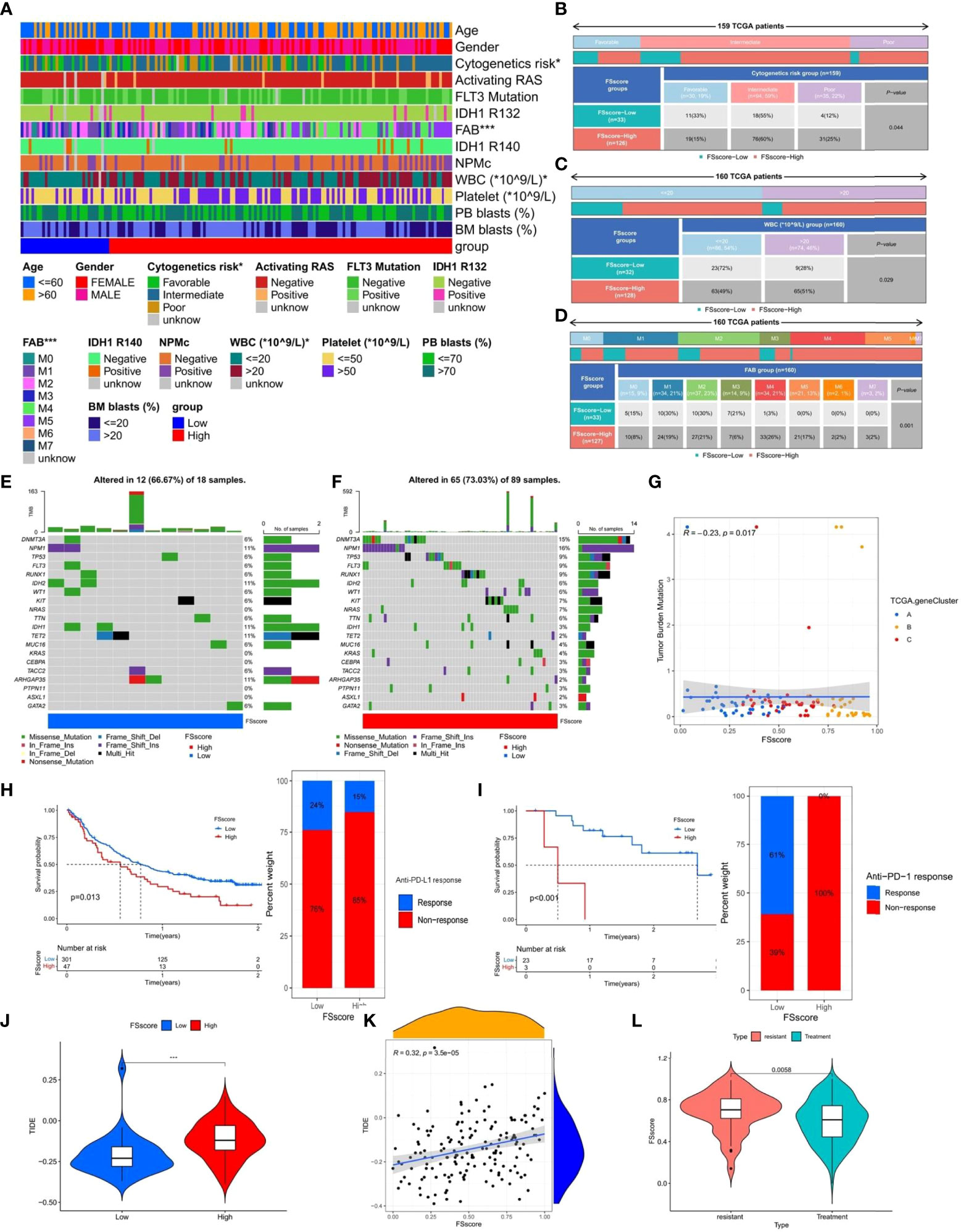 Figure 7 The relationship between clinicopathological factors, tumor somatic mutations, immunotherapy and FSscore. (A–D) Correlation analysis between clinicopathological factors and FSscore in the TCGA group, Fisher’s exact test, *P < 0.05. (E, F) The characteristics of tumor somatic mutations in the high and low FS score groups of the TCGA group, WBC: white blood cell, PB: peripheral blood, BM: Bone marrow, IDH: isocitrate dehydrogenase, NPMc: nucleophosmin. (G) Correlation analysis between TMB and FSscore in the TCGA group. (H, I) Differences in survival of patients and the proportion of patients in high and low FSscore groups of immune checkpoint inhibitor treatment cohorts (H: IMvigor210, I: GSE78220), log rank test. (J) Differences in TIDE scores of the high and low FS score groups in the TCGA group. (K) Correlation analysis between TIDE score and FSscore in the TCGA group. (L) The difference in FSscore between drug-resistant and nonresistant patients. ***P < 0.001.