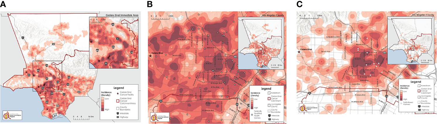 The structure provided by these guidelines is essential when considering the vast diversity of municipal regions of the United States, such as Los Angeles, California, which is home to roughly 10 million people (13). The County has a large Latinx1 population, is considered the capital of Asia America, has the second-largest sexual and gender minority population in the country, spans a vast socioeconomic gradient, and covers both urban and semirural geographies (14–16). As such, the County is home to a large number of individuals who experience health inequities, with greater vulnerability among those who are foreign-born, lower socio-economic status, and living in areas with high ethnic concentration. Using a mixed methods approach, Cedars-Sinai Cancer embarked on a two-year assessment to meet NCI catchment area criteria while also maintaining a high level of cultural inclusion and sensitivity needed for serving one of the most diverse counties in the US.