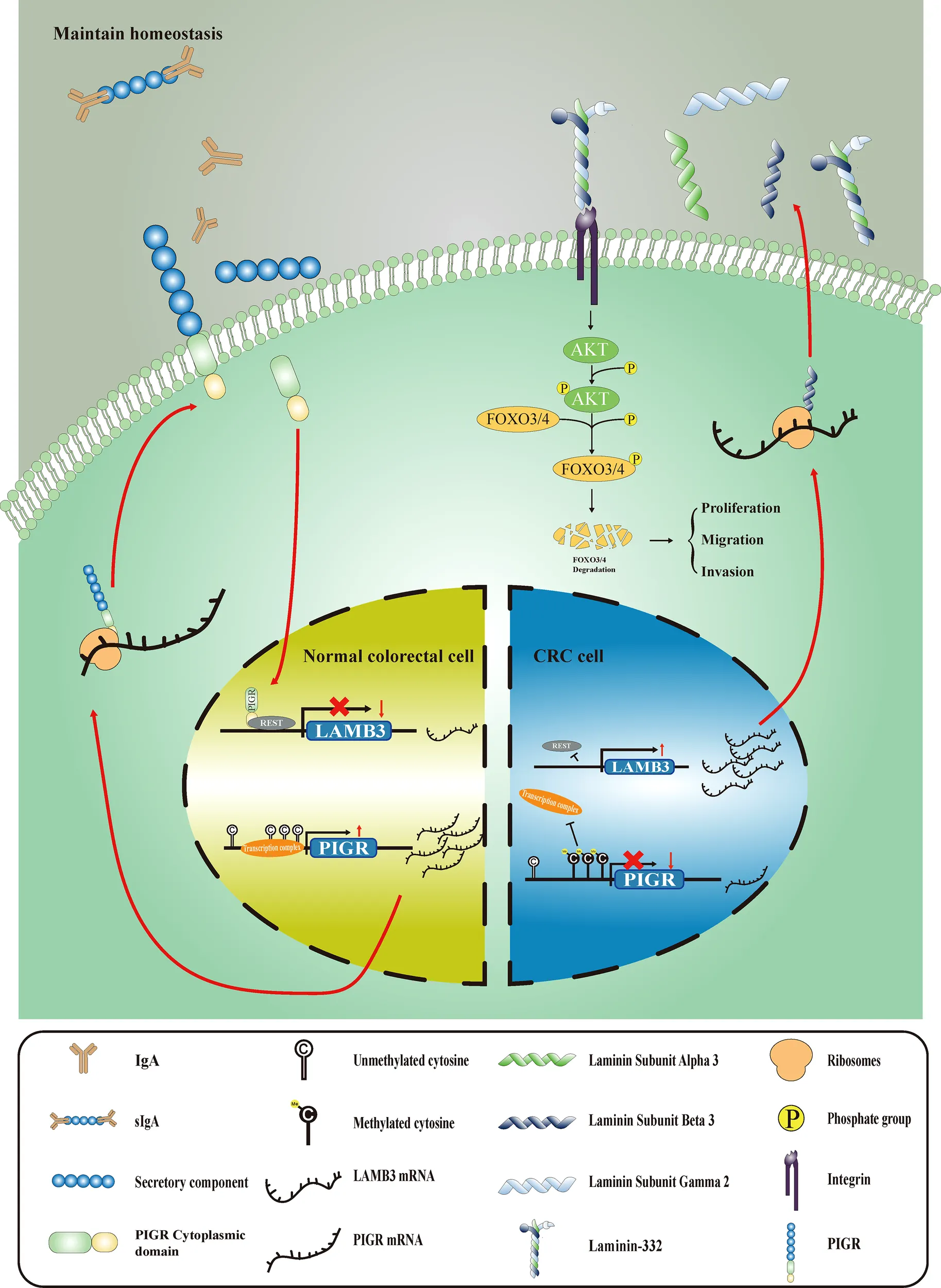 Colorectal cancer (CRC) remains one of the most common malignancies worldwide and its mechanism is unclear. Polymeric immunoglobulin receptor (PIGR) which plays an important role in mucosal immunity is widely expressed in the mucosal epithelium and is dysregulated in different tumors. However, the role and underlying mechanisms of PIGR in CRC remain unclear. Here, we demonstrated that PIGR was hypermethylated and downregulated in our cohort (N = 272), and these features were associated with reduced overall survival in patients (HRmethylation 1.61, 95% CI [1.11-2.33]). These findings were validated by external TCGA and GEO data. Moreover, PIGR overexpression inhibits CRC cell malignant phenotypes in vitro and impedes CRC cells growth in male BALB/c nude mice. Mechanistically, PIGR physically associates with RE1 silencing transcription factor (REST) and blocks the transcription of laminin subunit beta 3 (LAMB3). Subsequently, the AKT-FOXO3/4 axis was suppressed by downregulated LAMB3. In the drug sensitive assay, PIGR-overexpressing cells were more sensitive to cisplatin and gemcitabine. Together, PIGR may serve as a powerful prognostic biomarker and putative tumor suppressor by suppressing the AKT-FOXO3/4 axis by downregulating LAMB3 in CRC. Our study may offer a novel therapeutic strategy for treating CRC patients who highly express PIGR with cisplatin and gemcitabine.