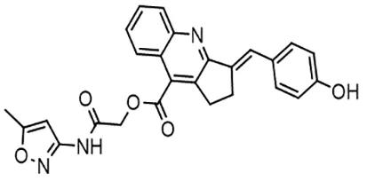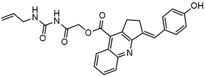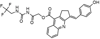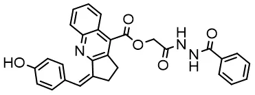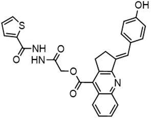 In parallel, the scaffolds producing the most active compounds, ST3ND-2 and ST3ND-5, were screened in similarity searches to identify potential binders in similar chemical structures. The 3D similarity search engine GIGA (https://www.molsoft.com/giga-search.html) was used to screen the REAL database of 1.2 billion synthesizable compounds from Enamine (https://enamine.net/library-synthesis/real-compounds/real-database). The web tool SciWalker (OntoChem, https://ontochem.com/2020/11/05/sciwalker-and-sciwalker-studio-as-integrated-tools-for-knowledge-extraction/) was used for searching the SAVI database. The sets of potential hits identified by these similarity searches were subjected to the three-step docking screen procedure described above that has proven to reliably identify effective binders. Activity testing allowed for validation of virtual screen results (compounds ST3ND-8-10, 21-28 and 35-36) and provided insights into structure-activity relationships within the series. Screening large diverse libraries thus permits “virtual medicinal chemistry,” allowing to identify structural motifs critical for the activity. As can be noted from Tables 1 and 2, most hits contain a phenolic group that appears to contribute significantly to the binding. It fits well in the pocket, and forms hydrogen bonds with the amide carbonyl of Glu111 and the guanido group of Arg114 (Figure 1D), thus adding significantly to interaction energy. As the most active compounds have been derived from (Z)-3-(4-hydroxybenzylidene)-2,3-dihydro-1H-cyclopenta[b]quinoline-9-carboxylic acid, we proceeded with optimization of these derivatives using Molsoft’s ligand editor. The best-scoring compounds, ST3ND- 33 and 34, were synthesized and assessed for binding and biological activity. Only compound 34 showed some improvement in activity compared to the best compound identified from the screens, ST3ND-25.