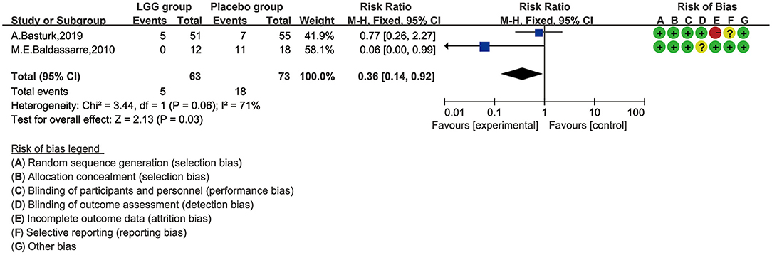 We selected the negative rate of the fecal occult blood test for quantitative synthesis of data. We tried to use the random-effect model for data analysis. Heterogeneity was found (I2 = 71%), and the random-effect model was finally selected. As shown in Figure 5, the LGG group can obtain a higher negative rate of fecal occult blood test compared with the placebo group, and there was a significant difference between the two groups (RR, 0.36; 95% CI, 0.14–0.92; p = 0.03).