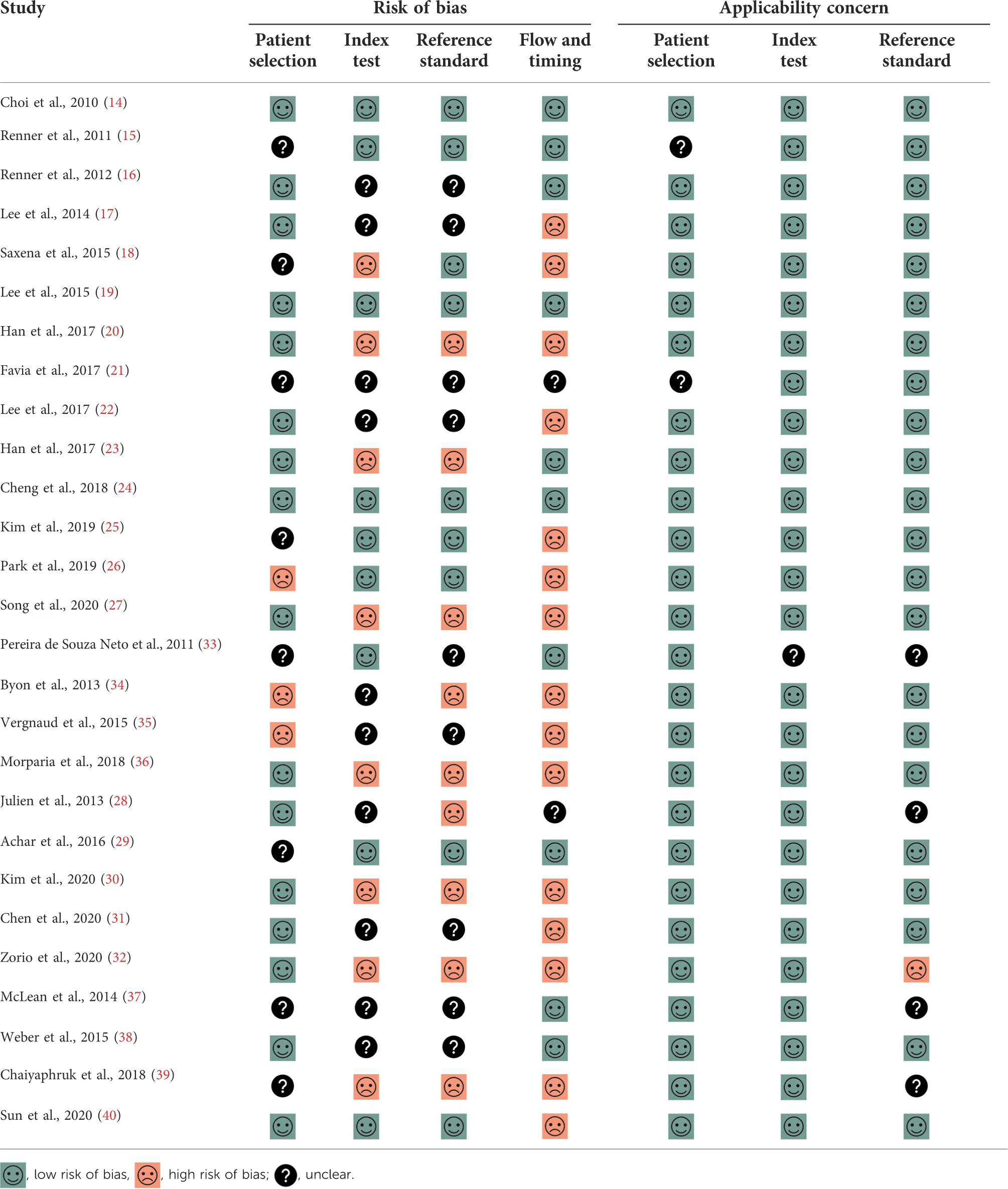The risk of bias assessment of all included studies is shown in Table 2. The reference standard domain was judged to have a high risk of bias in 9 studies because the interpretation of the reference standard test was made with knowledge of index test results. The flow and timing domain were also judged to have a high risk of bias in 15 studies because all included patients were not in the final analysis (per-protocol analysis).