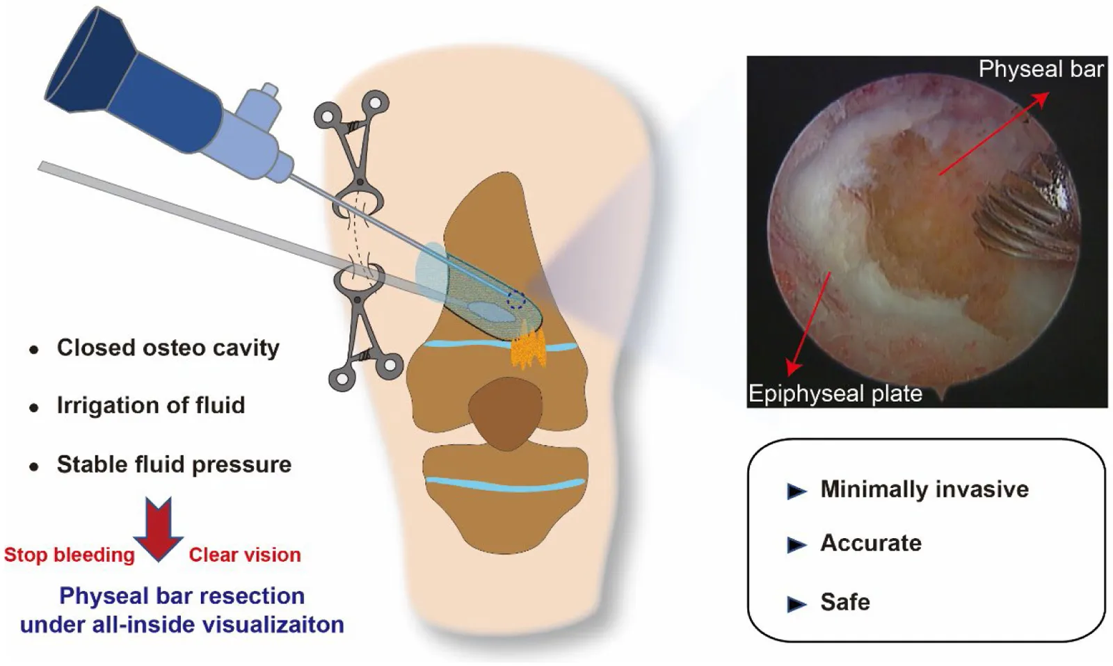 Using clamps to form a closed osteocavity could make physeal bar resection under all-inside arthroscopic visualization feasible, which is minimally invasive, accurate, and safe.