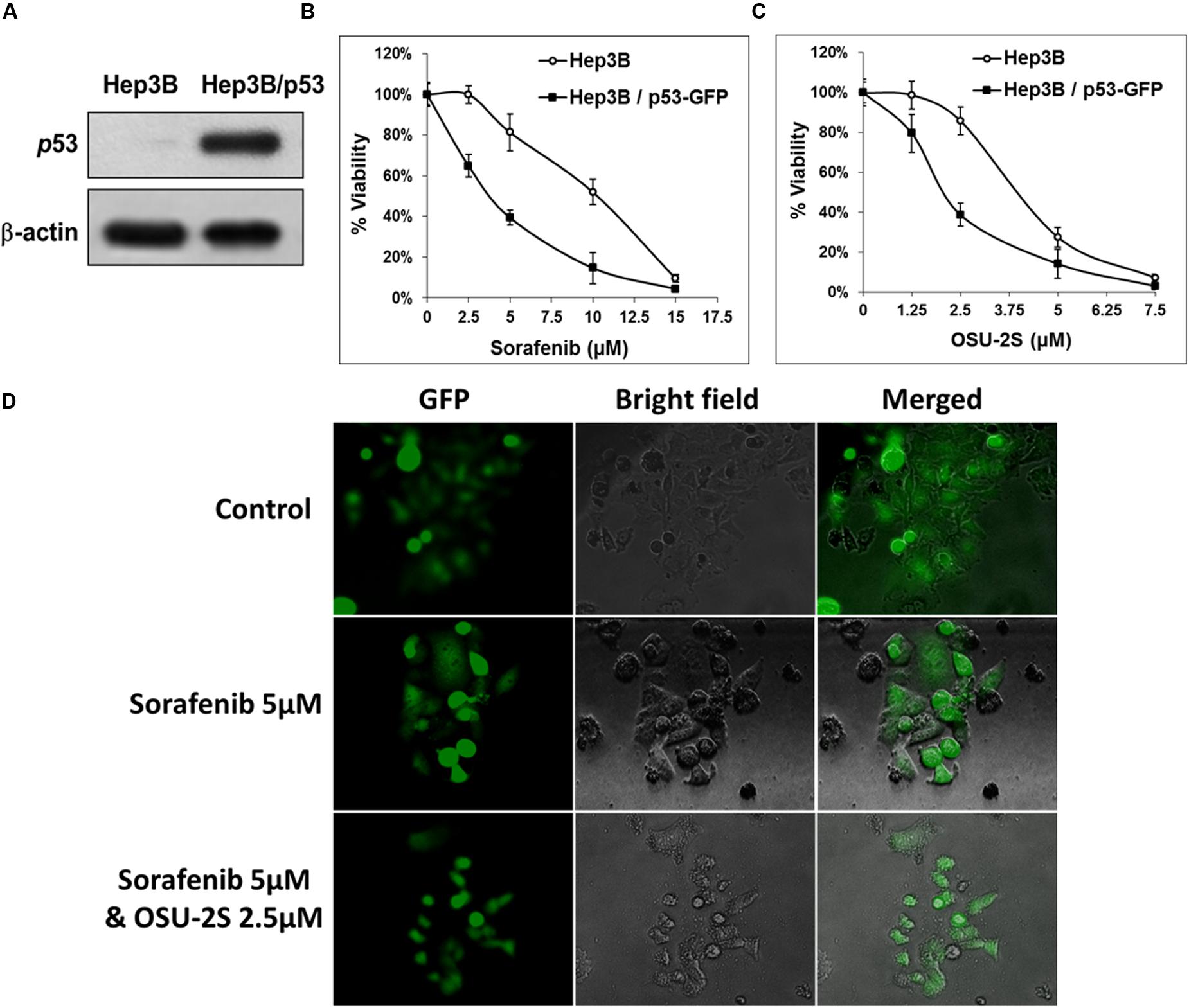 FIGURE 6. The over-expression of p53 in Hep3B cells restores the sensitivity to both sorafenib and OSU-2S. (A) Western blot analysis of the differential expression levels of p53 in untransfected Hep3B cells versus Hep3B cells over-expressing p53. Effect of p53 over-expression on the sensitivity of Hep3B cells to (B) sorafenib or (C) OSU-2S-mediated inhibition of cell viability measured by MTT assay. Points, mean; bars, SD (n = 6). (D) Fluorescence and direct light microscopy of Hep3B cells over-expressing p53 on the indicated treatments.