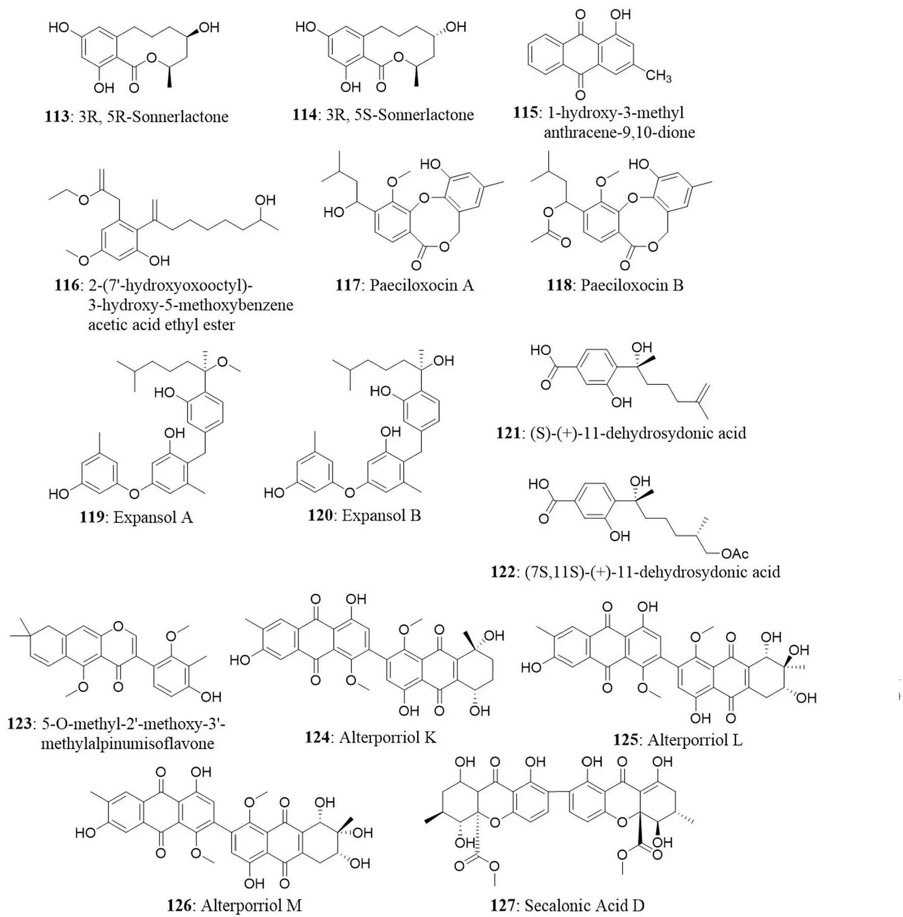 | 12 | Alternaria tenuissima | Sinopodophyllum emodi (Wall.) Ying | Chloroform extract: 50.5 mg; Butanol extract: 348 mg; Methanol extract of the mycelia: 1139.9 mg | Liang et al., 2016 |