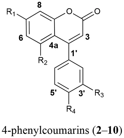 chlorogenic acid (1); 5-O-β-D-glucopyranosyl-7,3′,4′-trihydroxy-4-phenylcoumarin (2); 5-O-[β-D-xylopyranosyl-(1 → 6)-β-D-glucopyranosyl]-7-methoxy-3′,4′-dihydroxy-4-phenylcoumarin (3); 5-O-[β-D-apiofuranosyl-(1 → 6)-β-D-glucopyranosyl]-7-methoxy-3′,4′-dihydroxy-4-phenylcoumarin (4); 5-O-β-D-galactopyranosyl-7-methoxy-3′,4′-dihydroxy-4-phenylcoumarin (5); 5-O-β-D-glucopyranosyl-7-methoxy-3′,4′-dihydroxy-4-phenylcoumarin (6); 6′′-O-acetyl-5-O-β-D-galactopyranosyl-7,4′-dihydroxy-4-phenylcoumarin (7); 6′′-O-acetyl-5-O-β-D-galactopyranosyl-7,3′,4′-trihydroxy-4-phenylcoumarin (8); 6′′-O-acetyl-5-O-β-D-galactopyranosyl-7-methoxy-3′,4′-dihydroxy-4-phenylcoumarin (9); 5-O-[β-D-xylopyranosyl-(1 → 6)-β-D-glucopyranosyl]-7,4′-dimethoxy-4-phenylcoumarin (10).