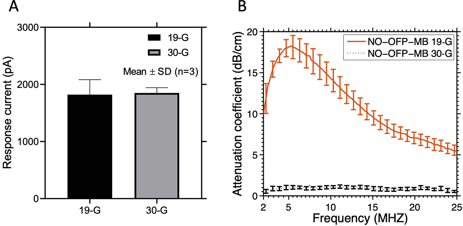 Figure 3 (A) The response current of the amperometric microelectrode sensor to NO-saturated solution obtained after injection through a 19-G or 30-G needle. (B) Attenuation coefficient of NO-OFP-MB 9:1 v/v obtained after injection through a 19-G or a 30-G needle. Injection through a 30-G needle resulted in a sharp decrease in the attenuation coefficient, and release of the gas payload. The mean ± 1 standard deviation is depicted (n = 3 per group) in each case.