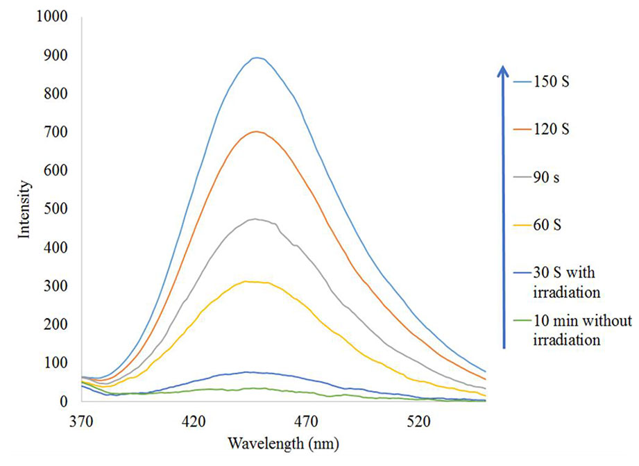 To prove the presence of •OH in the Fe3O4/SiO2/TiO2/CeVO4 (N5) system during UV irradiation, •OH trapping PL experiments using terephthalic acid (TA) as a probe molecule were also carried out (Figure 11). As shown in Figure 10B, after irradiation for 150 s, the strong PL signal is seen at 425 nm, and the intensity significantly increased with the irradiation time as a comparison with dark treatment, which shows •OH radicals have been generated.