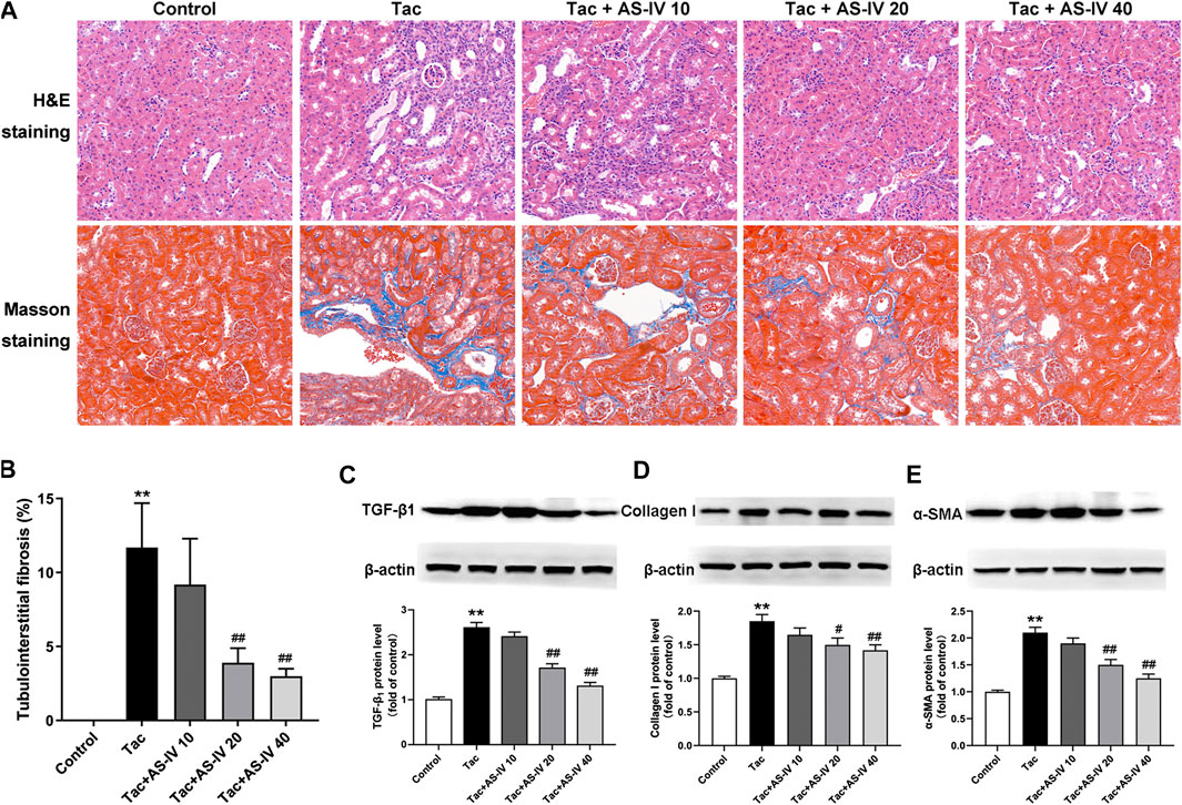 Figure 1. The protective effects of Astragaloside IV from tacrolimus-induced chronic nephrotoxicity in vivo (n = 8) (A) Representative images of HE and Masson staining of renal tissues in mice treated with tacrolimus ± Astragaloside IV for 4 weeks (B) Quantitative analysis of the ratio of tubulointerstitial fibrosis in Masson-stained tissues (C)–(E) Representative immunoblot image and its quantification of transforming growth factor β1 (TGF-β1), Collagen I and α-smooth muscle actin (α-SMA) in the kidney. **p < 0.01 vs. the Control group; #p < 0.05 and ##p < 0.01 vs. the Tac group.